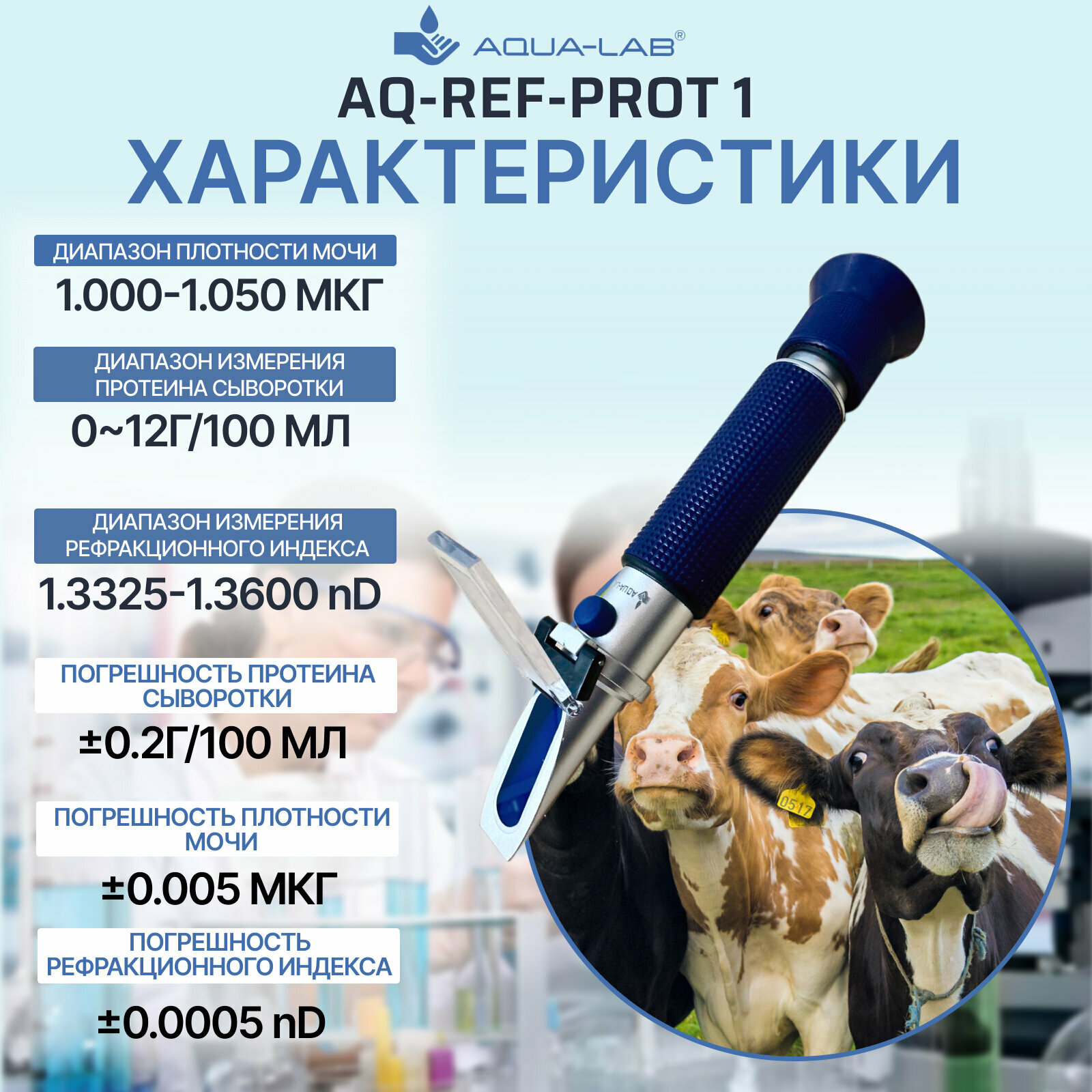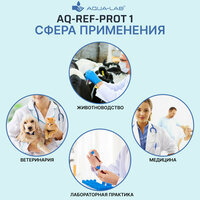 Ветеринарный рефрактометр AQUA-LAB AQ-REF-PROT1 для клинических исследований преимущественно выполняет тестирование общего количества белка (протеина) в сыворотке, а кроме того, определяет удельную массу белка в моче. Основная сфера применения это ветеринария. Как правило, животновод-ветеринар определяет протеин в сыворотке для того, чтобы понимать, успешно ли передалась, например, молодым телятам, иммунная защита из материнского молозива.