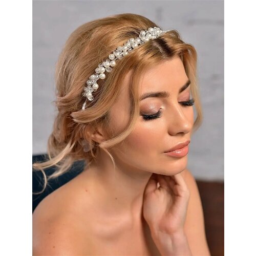 Свадебная веточка из жемчужин и прозрачных бусин. Изящная свадебная веточка невесты придаст вашей прическе лёгкости и шарма. Веточку можно надеть как ободок или вплести в локоны. Такой аксессуар отлично подойдёт под любой образ невесты. Свадебная веточка очень гибкая и хорошо держится! Цвет веточки под серебро, жемчужины тёплого белого оттенка. Венок из жемчуга отлично впишется в любой образ. Многие выбирают ободок из жемчужин под короткие свадебные платья. Также веточку из жемчуга и бусин можно вплести сбоку причёски, а также сзади. Веточка очень гибкая и удобная, она станет идеальным украшением в любую причёску невесты. Жемчужный ободочек также часто покупают для девочек на утренники и праздники в школу. Например, такой веночек подойдёт для новогоднего образа снегурочки и снежинки. Свадебные аксессуары невесты – это обязательно украшение волосы, поэтому составляя список покупок перед свадьбой не забывайте гибкий ободок на свадьбу для образа невесты. Не путайте веточки с диадемами невесты, так как – и короны надевают только как ободок, а вот веточки в причёску можно прикрепить и сделать из них любую форму, поэтому многие стилисты предпочитают веточки любым другим заколкам в волосы к вечерним и свадебным образам. Свадебный заколка на гибкой основе легко крепится и очень крепко держится. Подарите такую заколочку невесте на девичник или другой праздник, и точно ей понравится! Ширина декорированной части: 2 см Длина декорированной части: 27 см Длина лены по одной стороне: 38 см