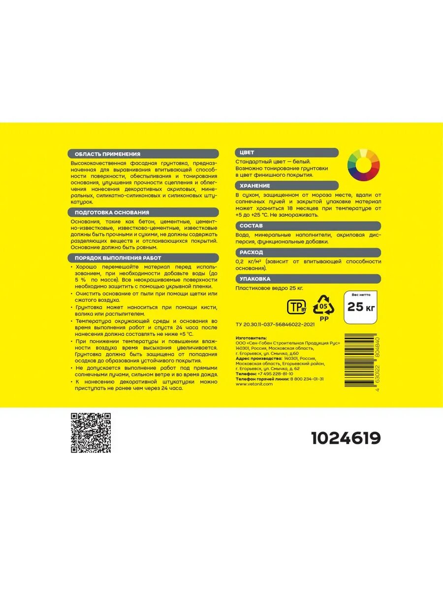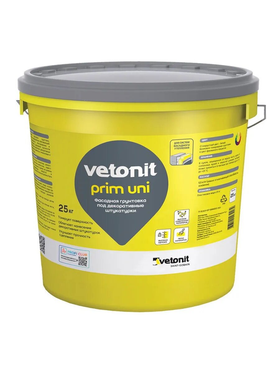 фасадная грунтовка под декоративную штукатурку vetonit 25 кг prim uni Prim uni – высококачественная фасадная тонирующая грунтовка для подготовки поверхности перед нанесением декоративных штукатурок на акриловой, силикатно-силиконовой, силиконовой основе.Выравнивает впитывающую способность основания, тонирует поверхность, облегчает нанесение декоративных штукатурок, укрепляет поверхность.