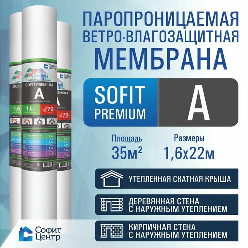 SOFIT PREMIUM A 35 м2- однослойная паропроницаемая мембрана, предназначенная для защиты утеплителя и внутренних конструкций кровель и стен от ветра, атмосферной влаги, а так же обеспечивает выведение водяных паров из утеплителя. Применение паропроницаемой мембраны позволяет сохранить теплозащитные характеристики утеплителя и продлить срок службы всей конструкции.