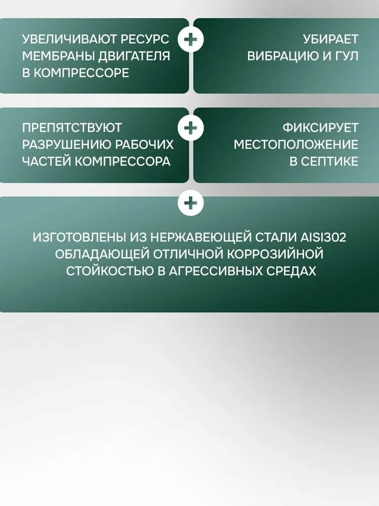 ✅Виброопоры для компрессоров SECOH JDK - эффективное решение для бесшумной работы септика, полностью устраняющее гул и вибрацию (100% эффективность). Специально разработанные для мембранного компрессора SECOH JDK они продлевают срок службы мембраны двигателя, снижают шумовую нагрузку до минимальных dB и предотвращают износ деталей от вибрации. ✅Антивибрационные ножки для компрессора из нержавеющей стали особенно важны для правильной работы аэратора септика на даче или в частном доме, а также для аэрации прудов и аквариумов, где важно сохранить живые аэробные бактерии и обеспечить качественную чистку сточных вод без использования химии. Трубчатая конструкция виброопор надежно защищает компрессор и электромагнитный клапан от повреждений, что делает их идеальным решением для систем с биоактиватором. ✅Применяются в различных типах очистителей - как с аэробными средствами, так и с анаэробными микробами, обеспечивая стабильную работу дачного туалета дома и эффективную очистку жидкости. Гарантируют долговечность оборудования и комфортную эксплуатацию системы биологической очистки.