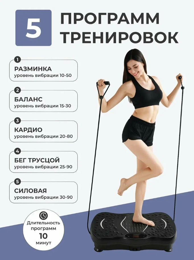 | Подробная комплектация | виброплатформа; шнур; 2 эспандера; инструкция на русском языке; пульт |
