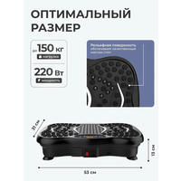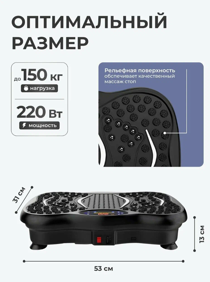 | Особенности | дисплей, компенсатор неровностей пола, массажные ремни, подогрев, программы тренировок, пульт ДУ, регулировка амплитуды колебаний, регулировка частоты вибрации, ручки-держатели, ручное управление, таймер, эспандеры |