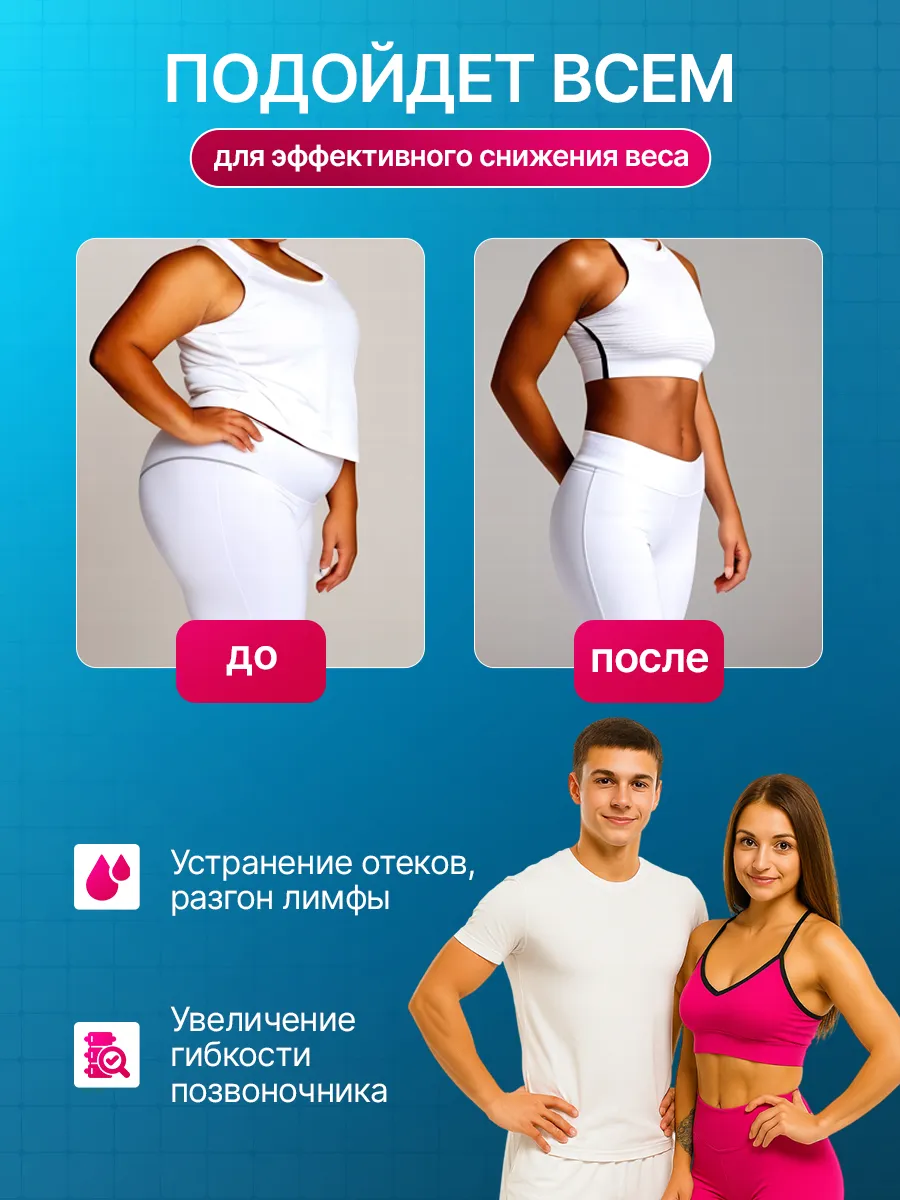 Виброплатформа для похудения и коррекции фигуры — восстановление мышц без усилий Испытайте на себе инновационную технологию, изначально разработанную для восстановления мышц космонавтов после пребывания в невесомости. Эта виброплатформа — ваш надежный помощник в мире фитнеса и красоты, который позволяет добиваться впечатляющих результатов, минимизируя нагрузку на суставы. Ключевые преимущества: Эффективное похудение и тонус мышц: Вибрации с частотой до 60 Гц заставляют мышцы тела рефлекторно сокращаться, что увеличивает расход калорий и способствует снижению веса. Укрепление опорно-двигательного аппарата: Занятия способствуют уплотнению хрящевой ткани, улучшению подвижности суставов и укреплению костной ткани. Улучшение кровообращения и борьба с целлюлитом: Вибрационное воздействие стимулирует кровообращение и лимфоток, помогая бороться с проявлениями целлюлита и хронической венозной недостаточности. Развитие вестибулярного аппарата и повышение настроения: Регулярные тренировки улучшают координацию и способствуют нормализации выработки гормонов, повышая общий тонус и настроение. Для кого этот тренажер? Виброплатформа станет отличным решением для тех, кто хочет поддерживать форму без изнурительных тренировок, восстанавливается после травм (после консультации с врачом), борется с лишним весом или просто ищет способ расслабиться и снять мышечное напряжение. Меры предосторожности и противопоказания: Перед началом использования проконсультируйтесь с врачом. Тренировки противопоказаны при беременности и в период лактации, наличии кардиостимулятора или других имплантированных электронных устройств, эпилепсии, тяжелых формах сахарного диабета, заболеваниях позвоночника, грыжах, мочекаменной болезни, а также в течение реабилитационного периода после операций и серьезных травм.
