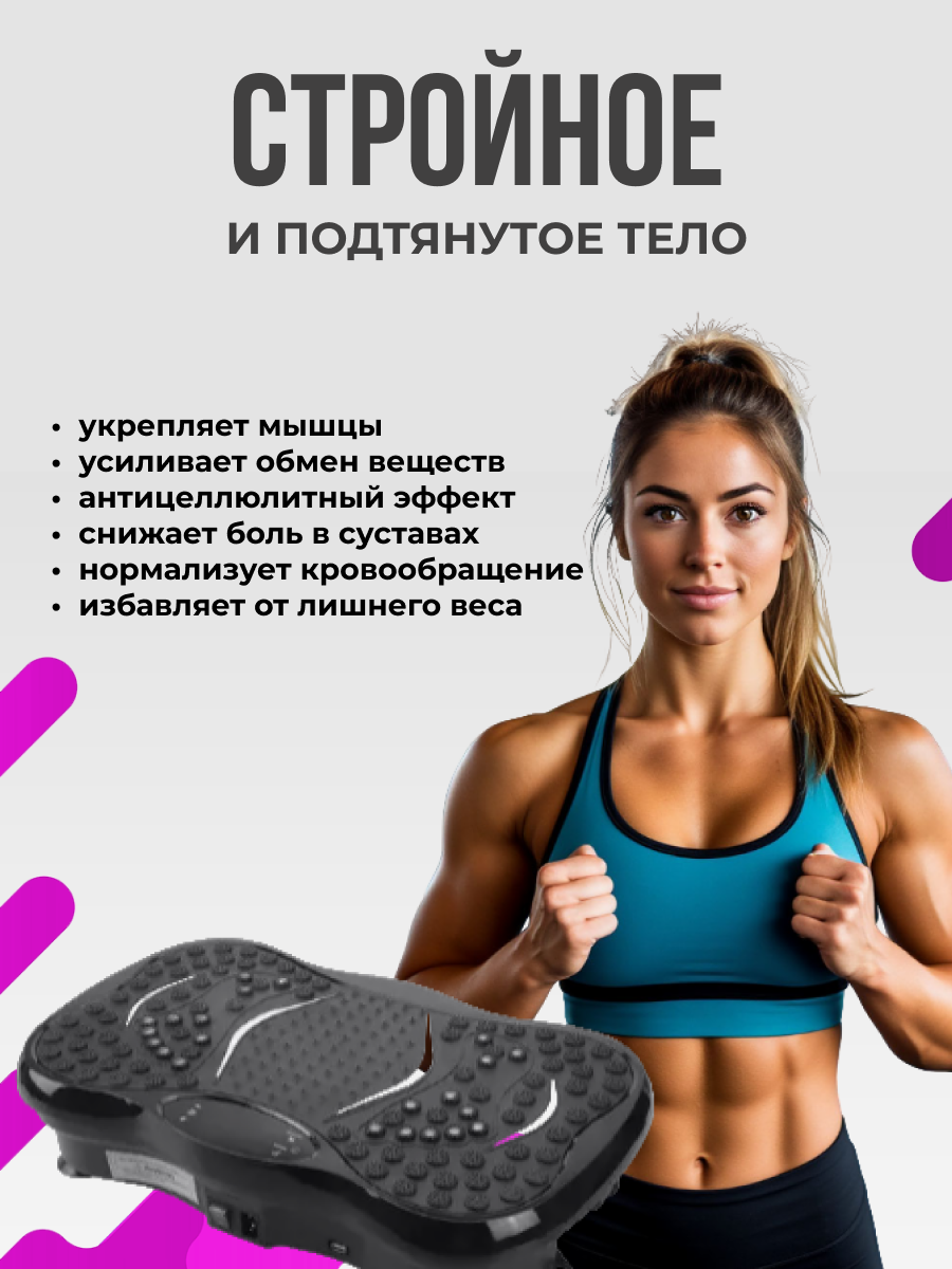 Виброплатформа – это инновационный спортивный инвентарь для эффективных тренировок дома. Она станет отличным помощником для женщин и мужчин, стремящихся поддерживать форму, заниматься фитнесом и достигать результатов в похудении. Использование этой поворотной платформы помогает проработать мышцы пресса, бедер, ног, рук, ягодиц и спины. Это удобное решение для домашних тренировок, которое идеально подходит как для начинающих, так и для опытных спортсменов. Тренировки на таком устройстве способствуют укреплению тела, улучшению растяжки и общей физической формы. Домашние занятия становятся комфортными благодаря компактности оборудования и возможности выполнять упражнения без лишнего оборудования. Спортивная виброплатформа разработана с учетом всех потребностей современного человека. Регулярные тренировки на этом устройстве помогут не только в укреплении мышц бедра или ягодиц, но также окажут положительное влияние на состояние спины. Эта универсальная платформа позволяет совмещать кардионагрузки с силовыми упражнениями. Она подходит женщине любого возраста, желающей сделать занятия спортом удобными и доступными прямо у себя дома. Такой спортивный инвентарь поможет создать полноценную программу тренировок без необходимости посещения зала. Этот домашний тренажер станет вашим надежным помощником в спорте!