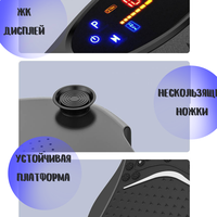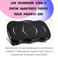 Массажер для похудения – это электрический спортивный тренажер, который прекрасно подойдет для занятий спортом дома. Виброплатформа для похудения тренажер имеет 5 режимов вибрации, 10 программ тренировок. Домашний тренажёр кардио создает высокочастотные вибрации и колебания, которые обеспечивают глубокую стимуляцию мышечных тканей, подтягивает тело и пресс, а также избавляет от целлюлита. Он работает на принципе вибрации и рефлекторной способности мышц быстро сокращаться и расслабляться. Антицеллюлитный массажер действует как лимфодренажный массаж для похудения, разгоняя лимфу. Также вибромассажер оказывает положительное воздействие на костные ткани, сухожилия и кровеносные сосуды. Мини степ платформа имеет рельефную поверхность, что положительно воздействует на ступни. 10 программ: тренировка для брюшной полости, расслабляющий режим, тренировка с плавающими движениями, беговой режим, бег трусцой, быстрая ходьба, ходьба, средняя интенсивность, тренировка повышенного уровня, кардио-тренировка. Тренажер для фитнеса выдерживает до 150 кг. и имеет 180 скоростей. Домашний напольный кардио тренажер заменяет полноценную кардио тренировку. Компактный И эргономичный дизайн позволяет с легкостью разместить ее в любой части вашего дома в отличие от громоздкого велотренажера, беговой дорожки, эллипсоида (эллиптического тренажера). Присоски на основании надежно закрепляют электромассажер на ровном полу. Вы можете тренироваться и смотреть любимый сериал или слушать музыку подключив телефон через Bluetooth. Выбрать программу, настроить время, переключить трек можно не отвлекаясь от тренировки с помощью дистанционного пульта управления, а вся информация будет отображаться на большом ЖК дисплее. Тренажер способна заменить диск для здоровья, занятия плаванием, и многие другие тренажеры для спорта. Удобный и недорогой степпер тренажер – это отличный способ быть всегда в форме.