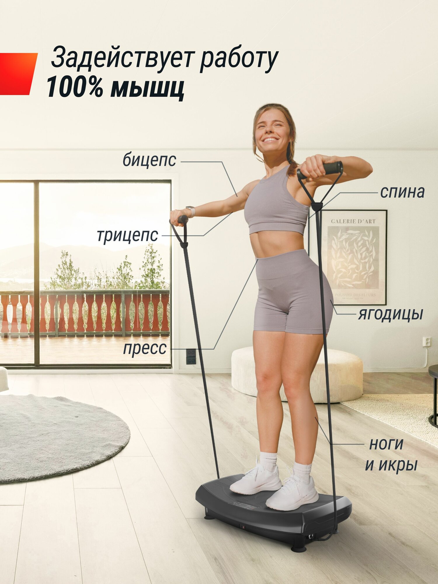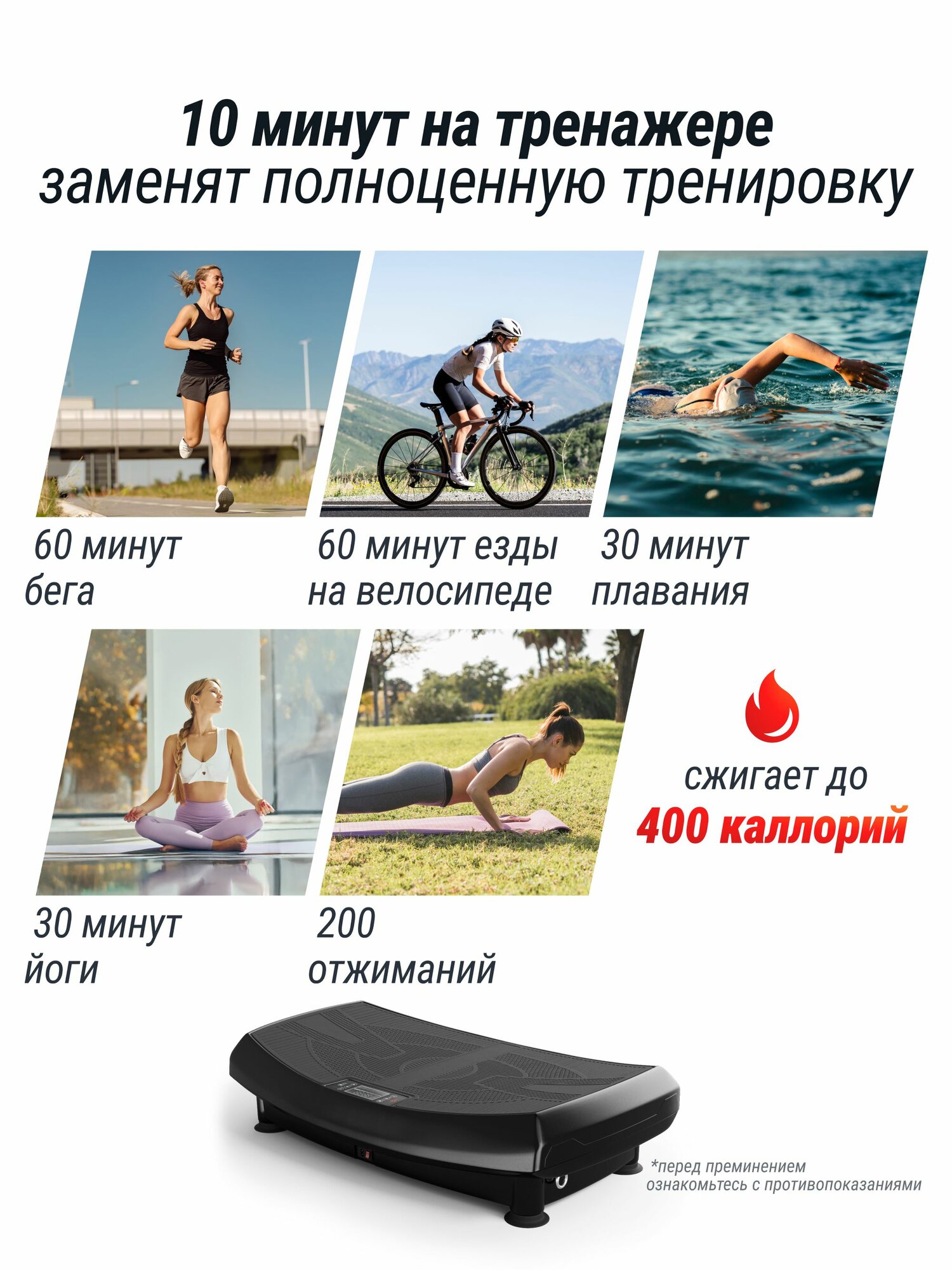 Виброплатформа, кабель питания, пульт управления, эластичный трос (2 шт.), коврик 67х37 см, руководство пользователя, сумка для телефона с креплением на руку, фитнес-браслет