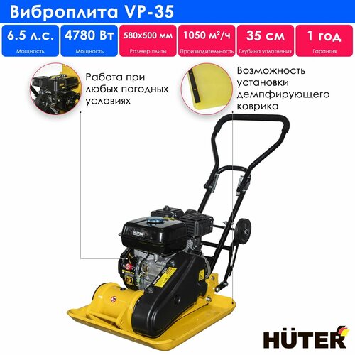 Бензиновая виброплита HUTER VP-35 предназначена для уплотнения песка, гравия, битумно-гравийной смеси (средней и мелкой зернистости), каменной брусчатки. Устройство утрамбовывает поверхность на глубину до 35 см.