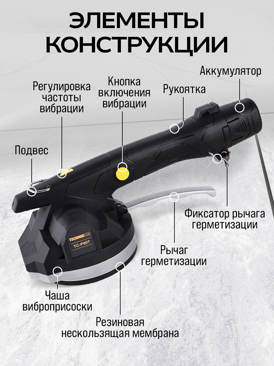 Виброприсоска для укладки плитки аккумуляторная TECHNICOM TC-P007, 12В, 1500 мАч, 6 скоростей, чаша 130мм, 100-12000 об/мин, нагрузка 100 кг: сравнение цен, характеристики, фото, актуальное наличие и цены.