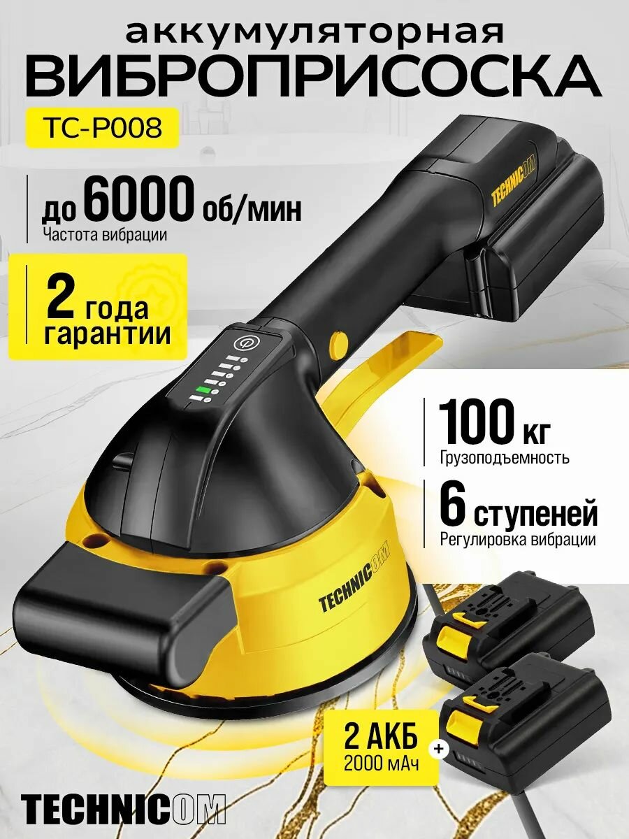 Виброприсоска для укладки плитки аккумуляторная TECHNICOM TC-P008, 16,8В, 2000 мАч, 6 скоростей, чаша 123мм, 3000-6000 об/мин, нагрузка 100 кг: сравнение цен, характеристики, фото, актуальное наличие и цены.