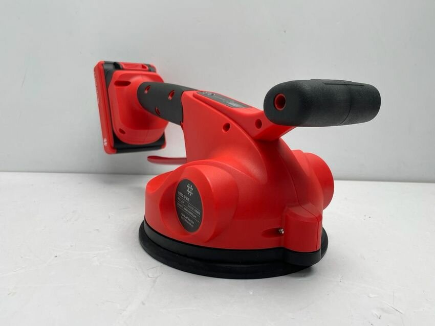 Чаша изготовлена из высококачественного полиуретана и не оставляет следов на плитке, имеет диаметр 166мм. Разряжение в ней (вакуум) создается и снимается одним нажатием рукояти. Изготавливается из металла. Эргономичная рукоятка разработана для большего удобства и безопасности работ. Работает виброприсоска от сменного литий-ионного аккумулятора (Li-ion) 21V, 2000mAh. На корпусе есть индикатор уровня заряда. В комплекте 2 аккумулятора, что обеспечивает бесперебойность работы.