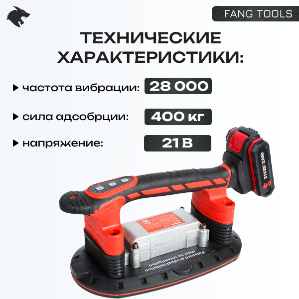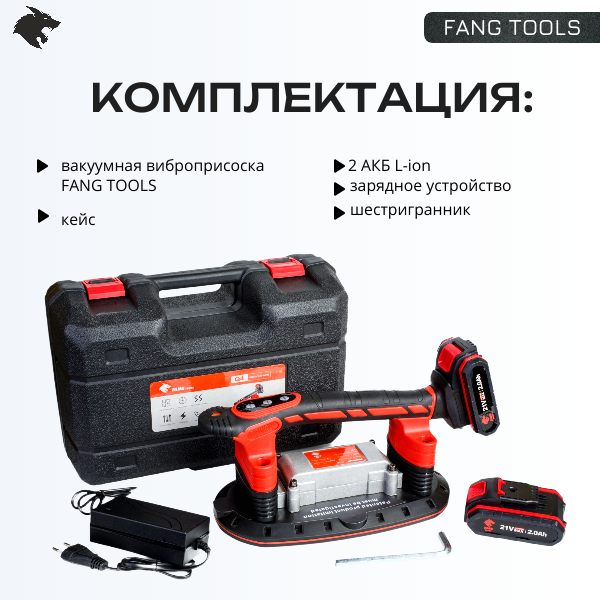 Виброприсоска Fang Tools - это инструмент для выравнивания плитки, который может использоваться для подъема, переноса и укладки тяжелых предметов. Она оснащена двумя аккумуляторами, которые обеспечивают до 12 часов работы без подзарядки.
