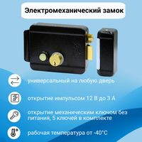 Электромеханический накладной замок с блокировкой кнопки выхода, корпус из окрашенной стали, снаружи открывается механическими ключами, изнутри — механической кнопкой выхода, удаленно — импульсом 12 В. Кнопка выхода механически блокируется от нажатия. Комплект поставки: замок, ответная планка, цилиндровый механизм, 5 механических ключей, набор крепежа, инструкция на русском языке. Габариты замка: 130x105x40 мм. Рабочая температура: -40.+50°C.