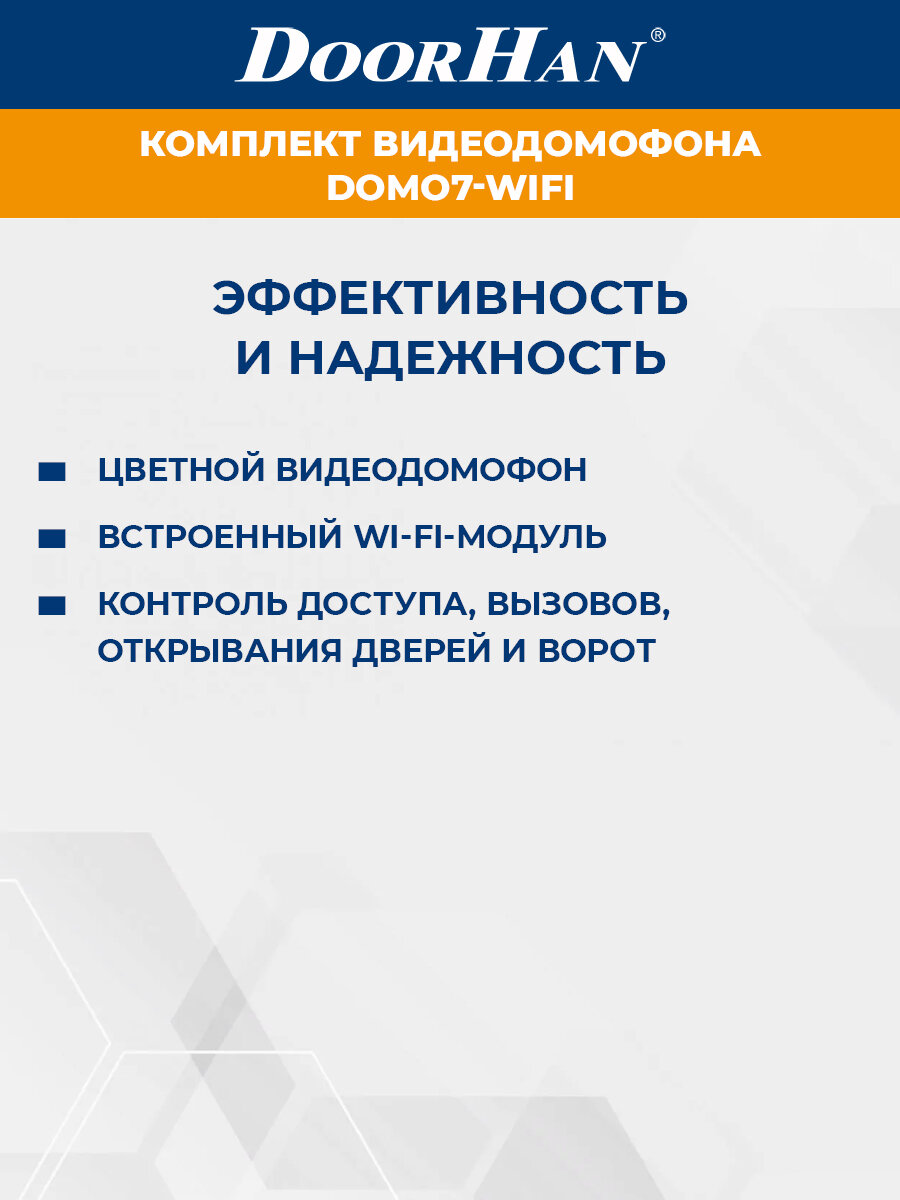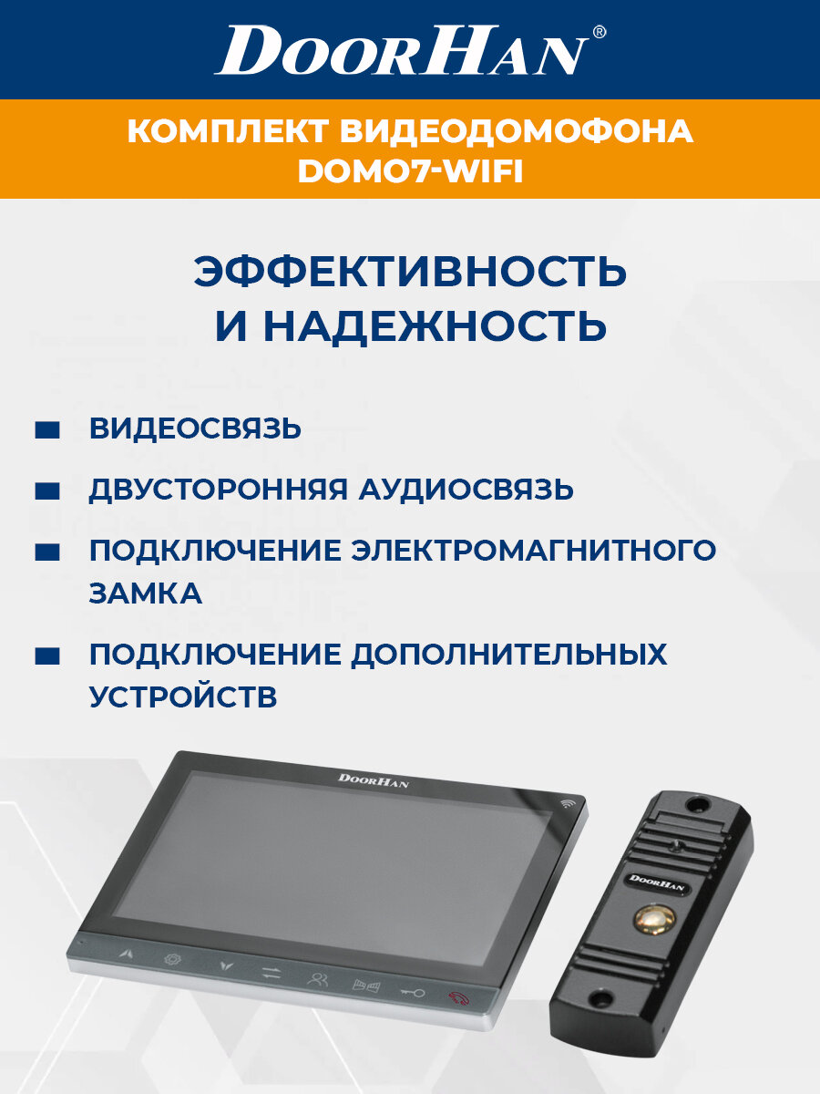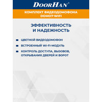 Комплект видеодомофона DoorHan с экраном 7 дюймов DOMO7-WIFI Цветной видеодомофон DOMO7-WIFI используется для круглосуточного контроля доступа, вызовов, открывания дверей и ворот, обеспечения безопасности коттеджей, дач, домов, гостиниц, офисов и других объектов. Домофон оснащен встроенным Wi-Fi-модулем, что позволяет управлять устройством удаленно.