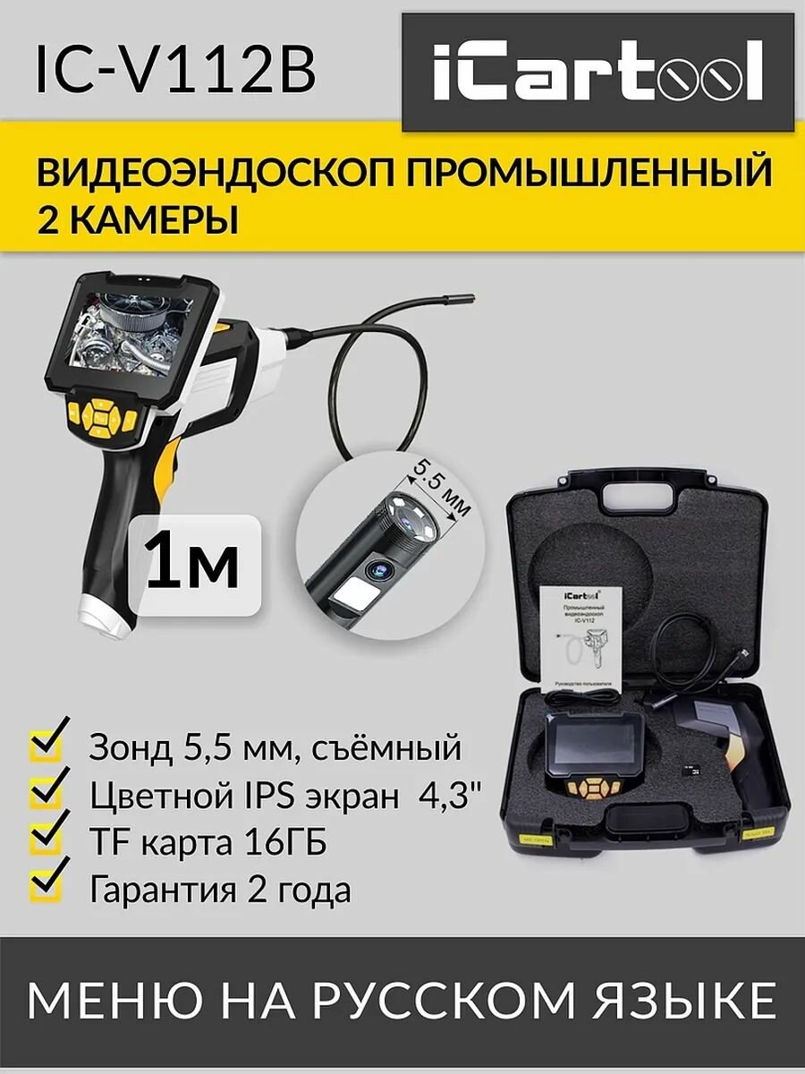 Промышленный видеоэндоскоп iCartool IC-V112B, оснащенный двумя камерами и ярким 4,3-дюймовым IPS экраном обеспечивает четкое изображение и широкий угол обзора, позволяя вам увидеть даже самые труднодоступные места. Зонд диаметром всего 5.5 мм делает устройство идеальным для работы в ограниченных пространствах. Станет незаменимым инструментом для профессионалов в сфере инспекции и диагностики.