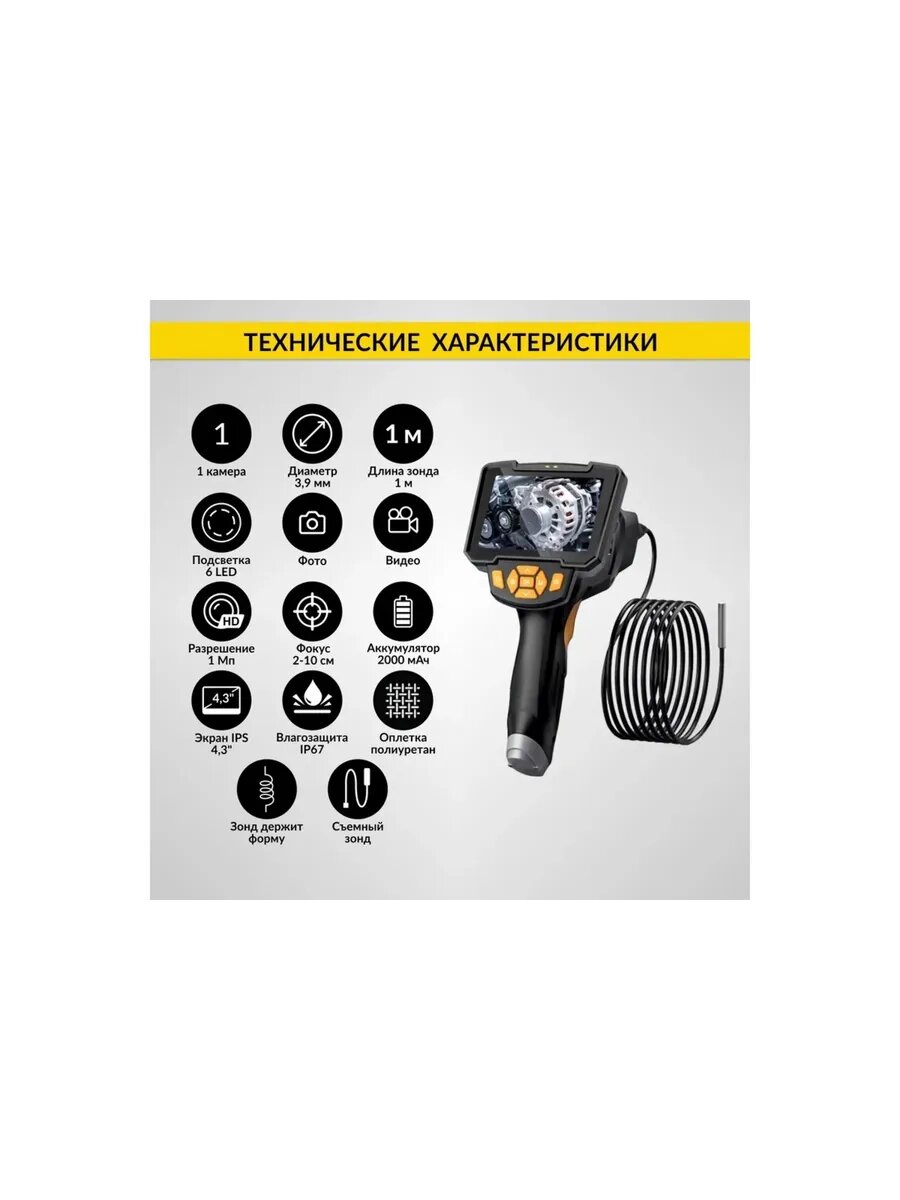 | Комплектация | Экран; Корпус видеоэндоскопа; Зонд 3.9 мм; Кейс с ложементом; Инструкция по эксплуатации; USB кабель для зарядки |
