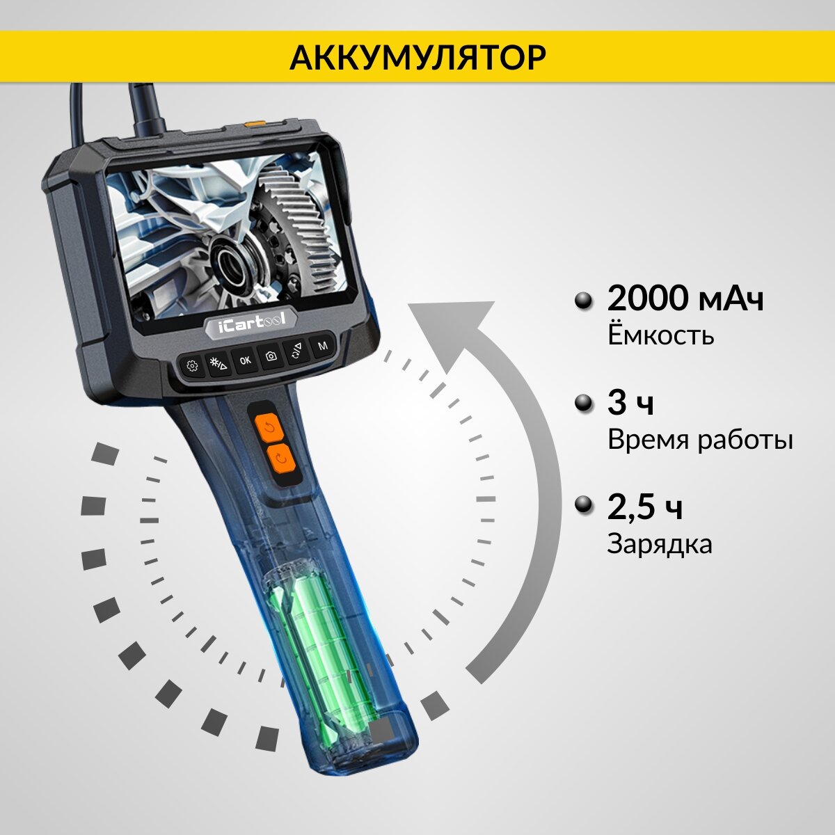 Промышленный видеоэндоскоп с вращением камеры iCartool IC-VC700R-5 имеет 2 камеры и IPS-экран 5” с разрешением HD. Главная особенность видеоэндоскопа – возможность управлять положением боковой камеры, вращая её на угол до ±350 градусов для кругового обзора с помощью кнопок. Идеально подходит для использования в таких отраслях, как машиностроение, строительство, энергетика и ремонт.