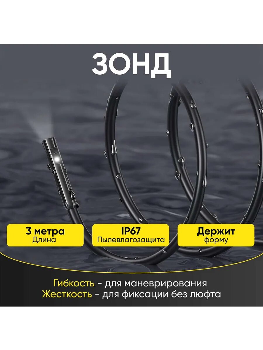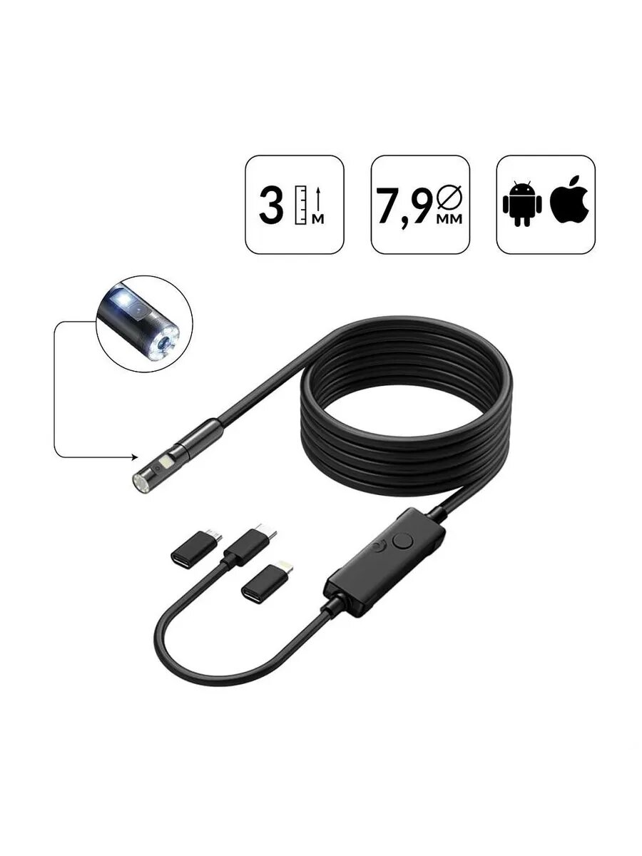 | Комплектация | Видеоэндоскоп с зондом Крюк Магнит Насадка-переходник Micro-USB Насадка-переходник Lightning Картонная упаковка Электронная инструкция |