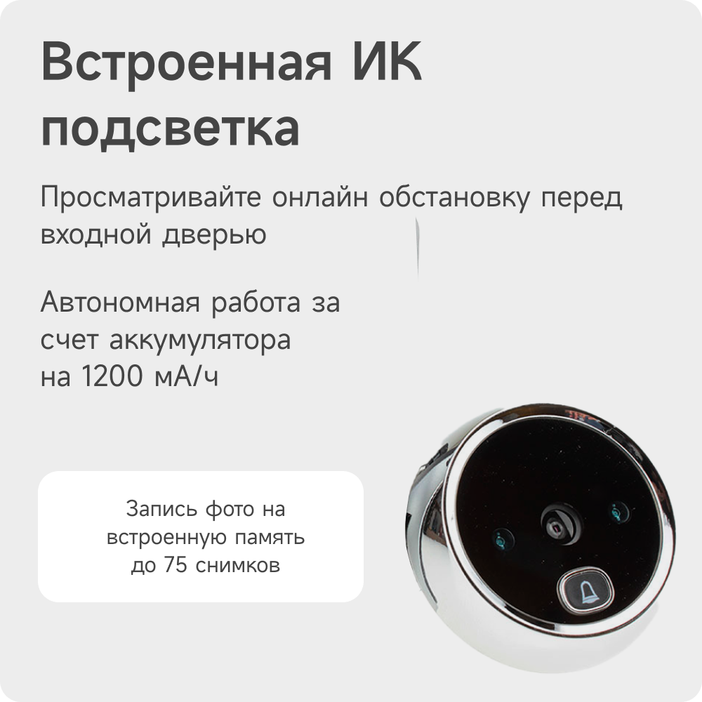 Видеоглазок во входную дверь со стильным дизайном. Отличное решение для наблюдения за входной дверью вашей квартиры. Видеоглазок обладает встроенной памятью и аккумулятором. Камера 0.3 Мп. Есть возможность записи фото вручную или по нажатию на кнопку дверного звонка. Также при нажатии на кнопку вызова проигрывается мелодия. При подключении к компьютеру по USB видеоглазок определяется как флешка и фотографии с легкостью можно перенести на ПК.