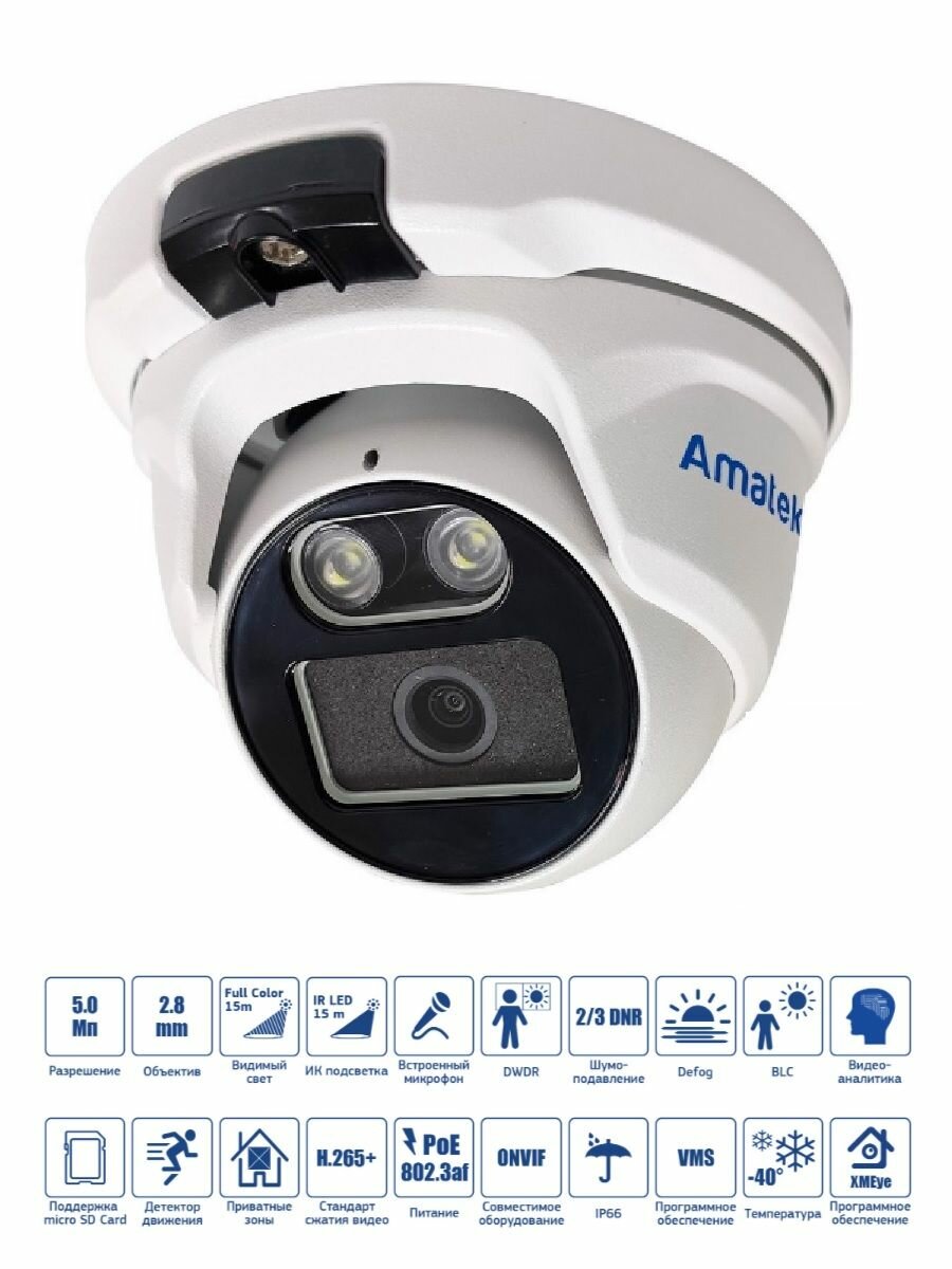 Купить Amatek AC-IDV502MFSX — купольная IP видеокамера 5Мп с совмещенной подсветкой с доставкой по всей России.