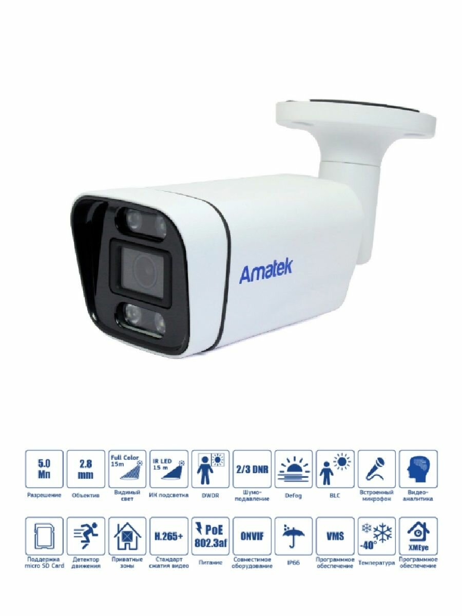 Купить Amatek AC-IS502MFSX — уличная IP видеокамера 5Мп с совмещенной подсветкой с доставкой по всей России.