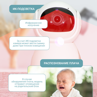 Детский блок измеряет температуру в комнате ребенка автоматически. Вы можете дистанционно управлять поворотом камеры. Поворот по горизонтали - 355°, по вертикали - 120°. Зум 10х. Возможно использование карты памяти MicroSD до 32 Гб.