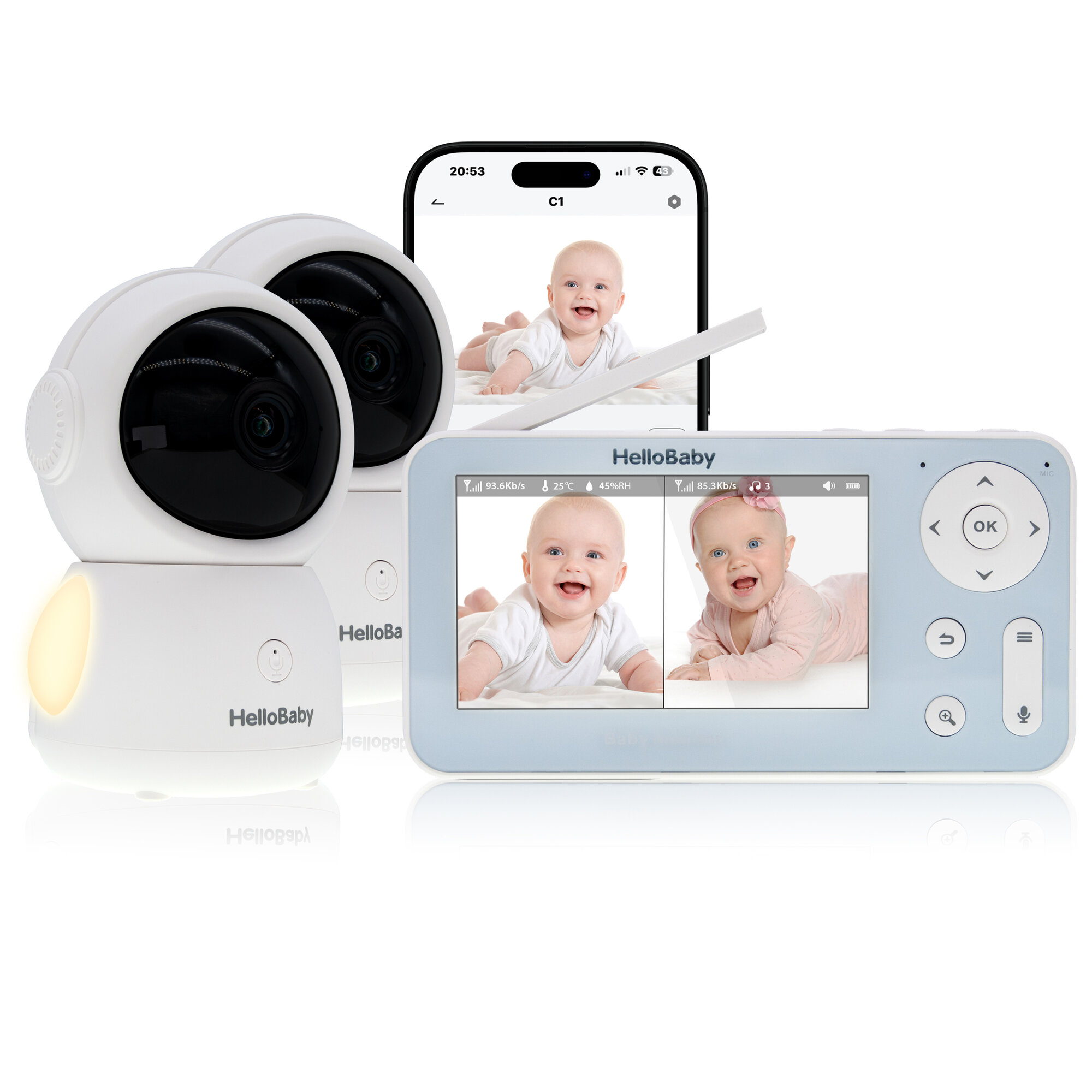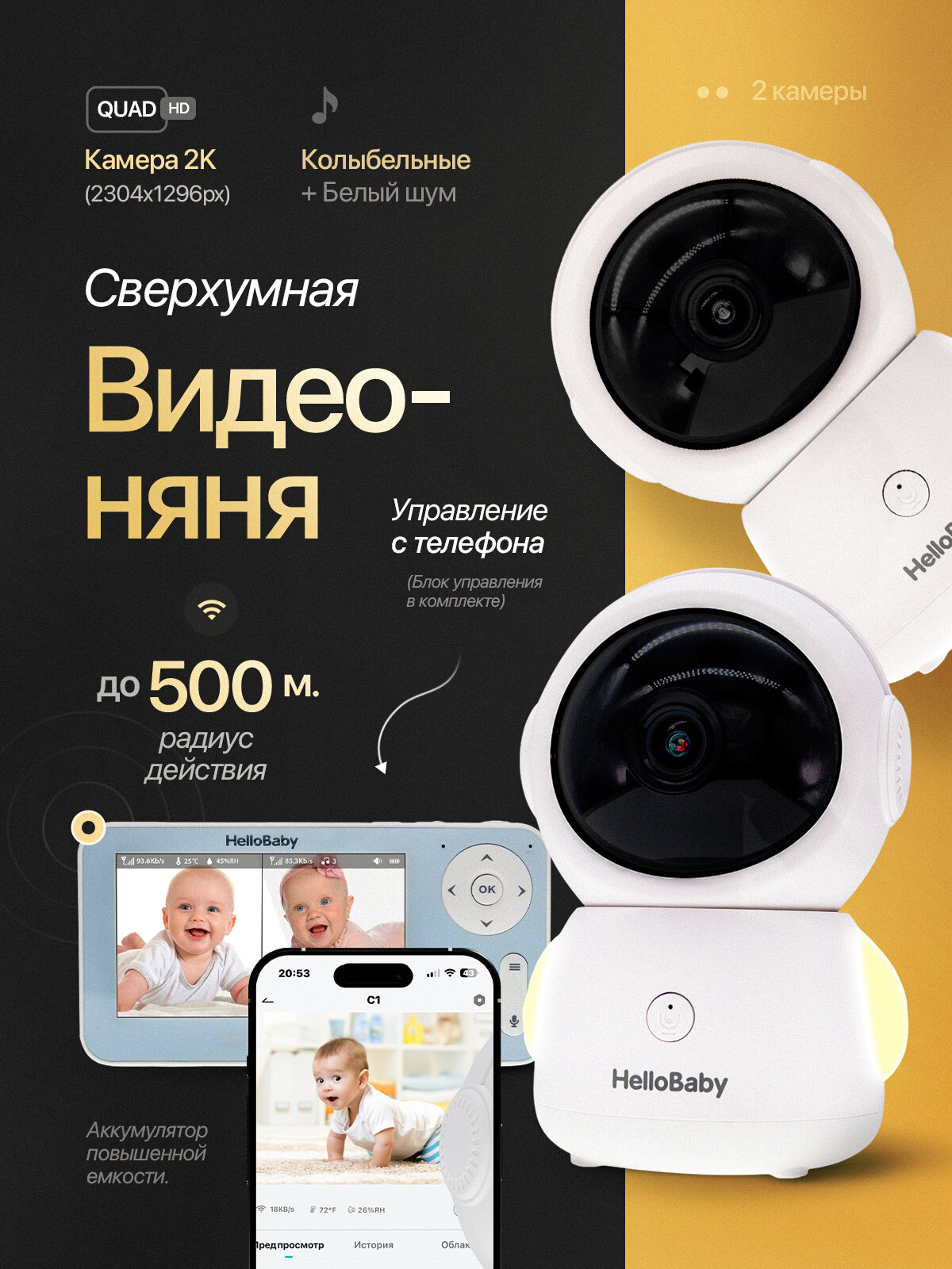 В комплект этой видеоняни включены монитор и две камеры, чтобы вы могли наблюдать за двумя детьми одновременно, вести мониторинг с разных ракурсов или контролировать обстановку в разных комнатах. Цифровая видеоняня Hellobaby HB110X2 с большим экраном и двумя камерами управлять которыми можно удаленно. В видеоняне собраны все важные функции, включая датчик движения и возможность подключения к смартфону или планшету для мониторинга из любой точки мира. Видеоняня непрерывно контролирует вашего малыша днём и ночью в режиме 24/7. Может работать в режиме экономии энергии и включаться при обнаружении звука (VOX) или движения вокруг камеры. При этих же событиях поступает пуш-уведомление на смартфоне, если вы подключили видеоняню к домашней сети Wi-Fi. С помощью функции обратной связи вы можете попытаться успокоить малыша на расстоянии, если он расплачется.