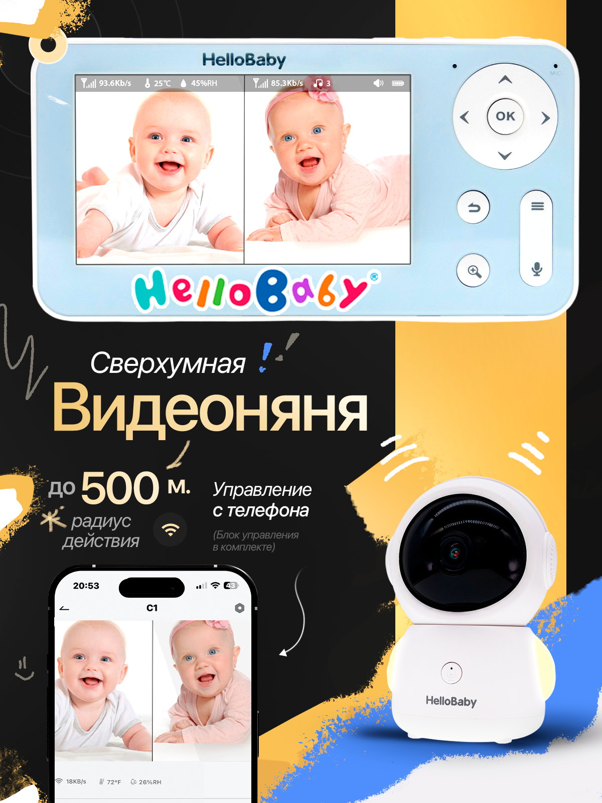 Цифровая видеоняня Hellobaby HB110 с большим экраном, диагональ которого составляет 11 см (4,3 дюйма) и поворотной камерой, управлять которой можно удаленно. В видеоняне собраны все важные функции, включая датчик движения и возможность подключения к смартфону или планшету для мониторинга из любой точки мира. Видеоняня непрерывно контролирует вашего малыша днём и ночью в режиме 24/7. Может работать в режиме экономии энергии и включаться при обнаружении звука (VOX) или движения вокруг камеры. При этих же событиях поступает пуш-уведомление на смартфоне, если вы подключили видеоняню к домашней сети Wi-Fi. С помощью функции обратной связи вы можете попытаться успокоить малыша на расстоянии, если он расплачется.