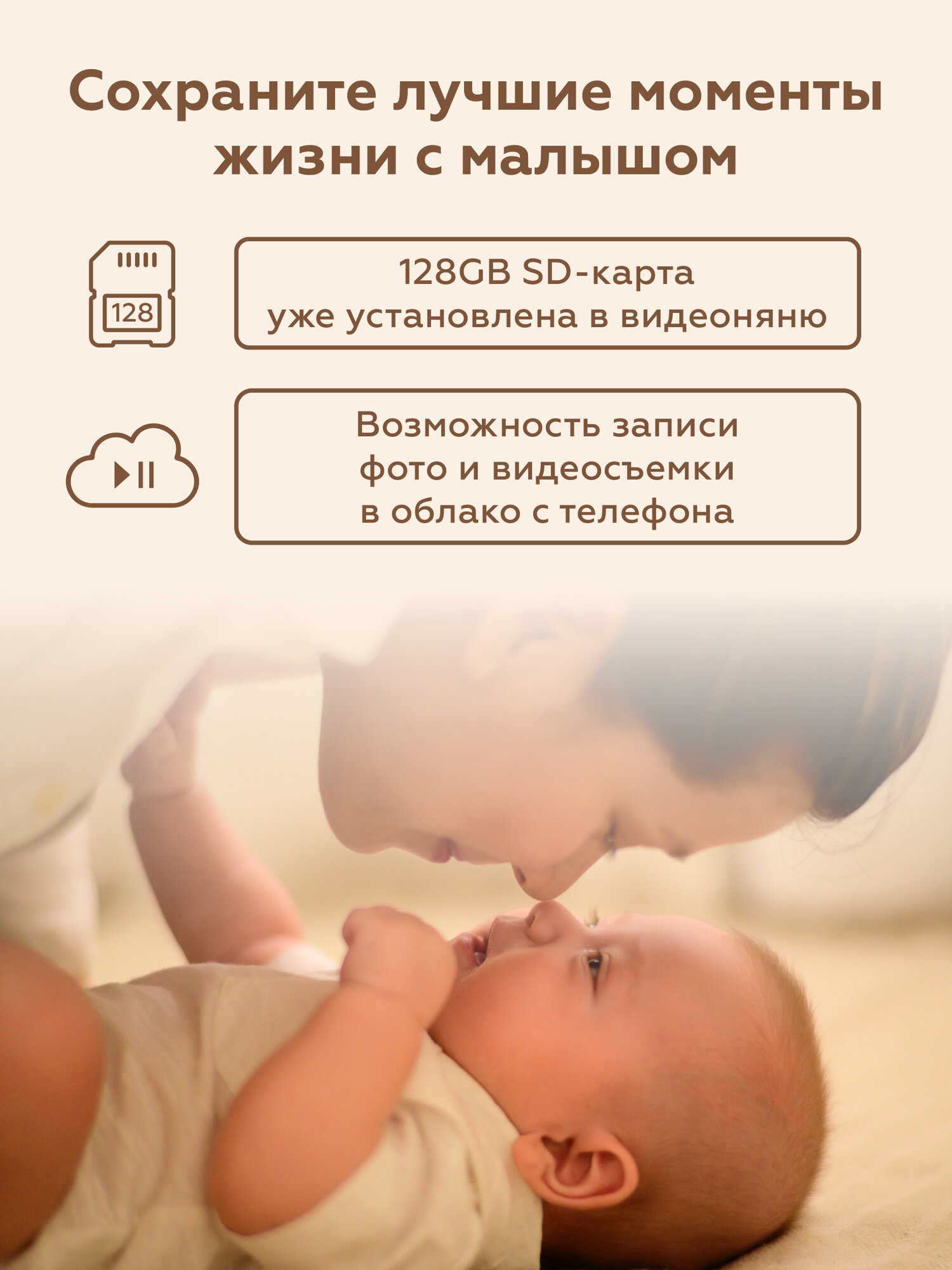 - Видеокамера оснащена SD-картой памяти на 128GB c возможностью фото и видеофиксации (сохраните лучшие моменты малыша).