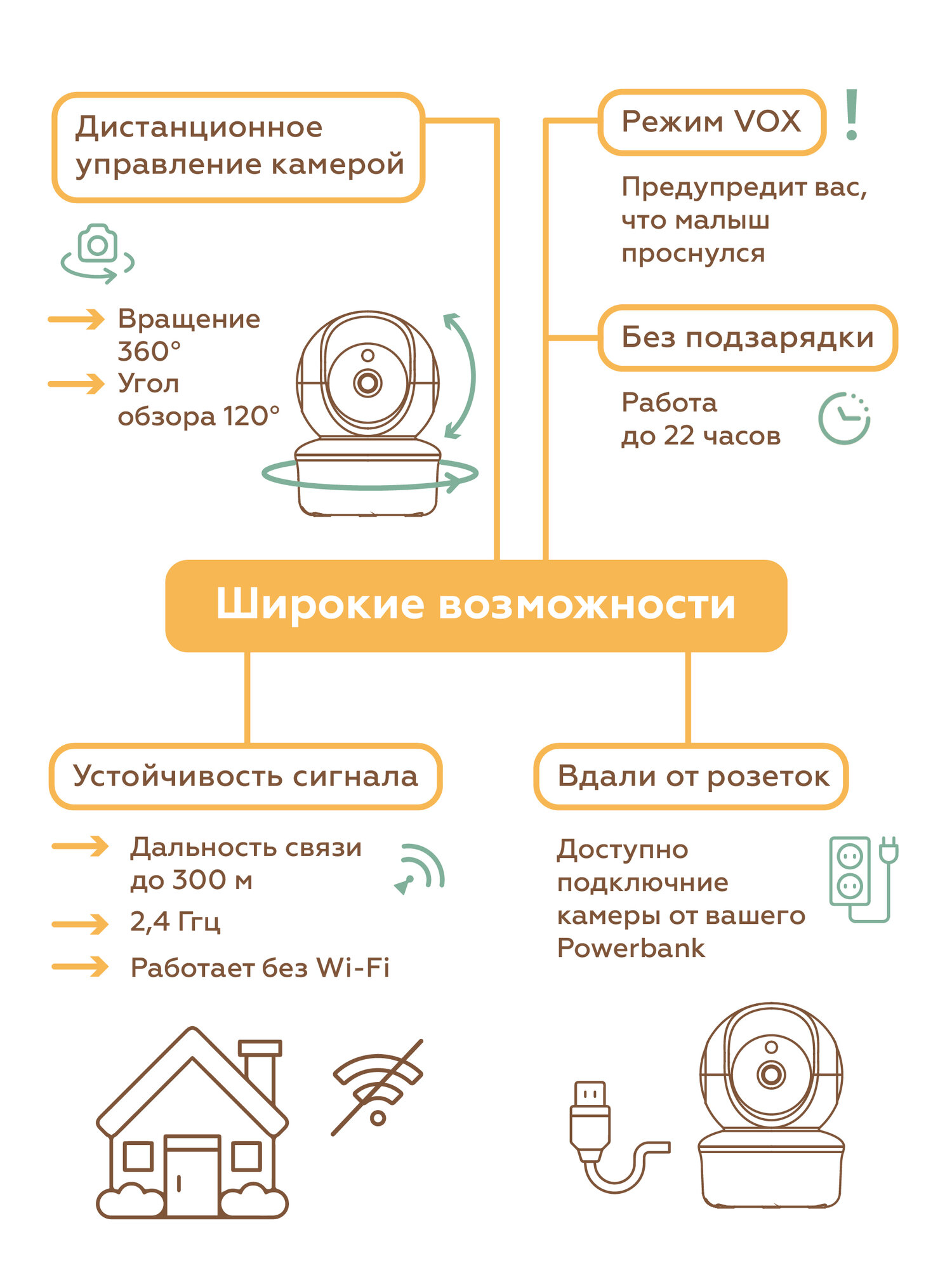1. Беспроводная связь: Наша видеоняня работает без интернета, что обеспечивает надежное и стабильное соединение. Вы можете быть уверены, что всегда будете на связи с вашим малышом.