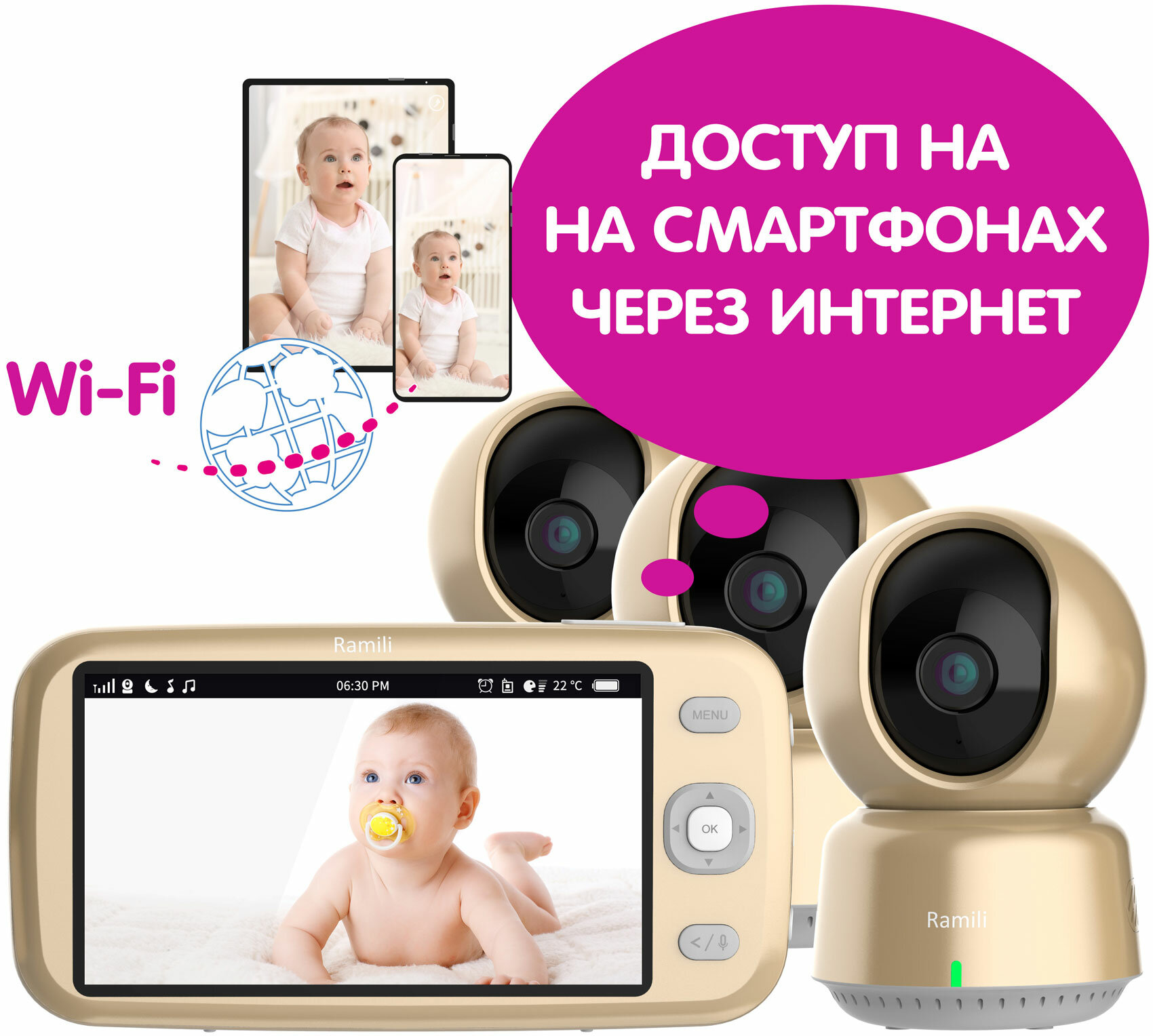 Видеоняня Ramili Baby RV1600X3 с доступом через интернет – это передовое устройство для присмотра за ребенком, которое обеспечивает спокойствие и комфорт для родителей. Включает в себя камеру и монитор, которые позволяют наблюдать за малышом на расстоянии до 400 метров с родительского блока при оптимальных условиях для связи и на неограниченном расстоянии с экрана смартфона или планшета через удобное приложение из любой точки мира.