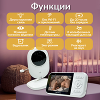 Видеоняня- это беспроводное устройство для малышей с ночным видением, состоящее из камеры и видеоэкрана. Камера устанавливается в комнате ребенка и записывает в прямом эфире все происходящее в радиусе своего покрытия с передачей на экран маме. Радионяня существенно облегчает жизнь родителям. Портативное устройство позволяет наблюдать за ребенком из любой точки дома в радиусе до 50 метров, а на открытом воздухе 100 м. Вы можете заниматься привычными делами по дому или по работе, отлучаться по необходимости и при этом не терять контроль над малышом. Современная видеоняня с монитором оснащена хорошей аудио и видео функцией ночного видения с инфракрасным датчиком. На экран монитора передаётся изображение высокой чёткости даже ночью. Двусторонний радиосигнал передаёт звук с камеры на родительский блок и обратно, позволяя малышу в любой момент услышать мамин голос. Камера может воспроизвести 8 колыбельных мелодий, которые помогут успокоить и уложить малыша. Монитор с ЖК-дисплеем 2.8 дюйма имеет встроенный аккумулятор и работает до 20 часов, заряжается от сетевого адаптера или USB кабеля. Камера имеет детектор звука, которую можно использовать для дома. Родительский блок имеет встроенный аккумулятор и может работать без сети, камера работает от сети или с возможным подключением через power bank (внешний аккумулятор). Кабель имеет длину 2,45 м. Видеоняня беспроводная работает без подключения к интернету и блютуз. Радионяня с камерой для новорожденных малышей отличный подарок на рождение ребенка, который можно подарить маме, подруге или сестре на день рождения или без повода.