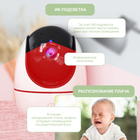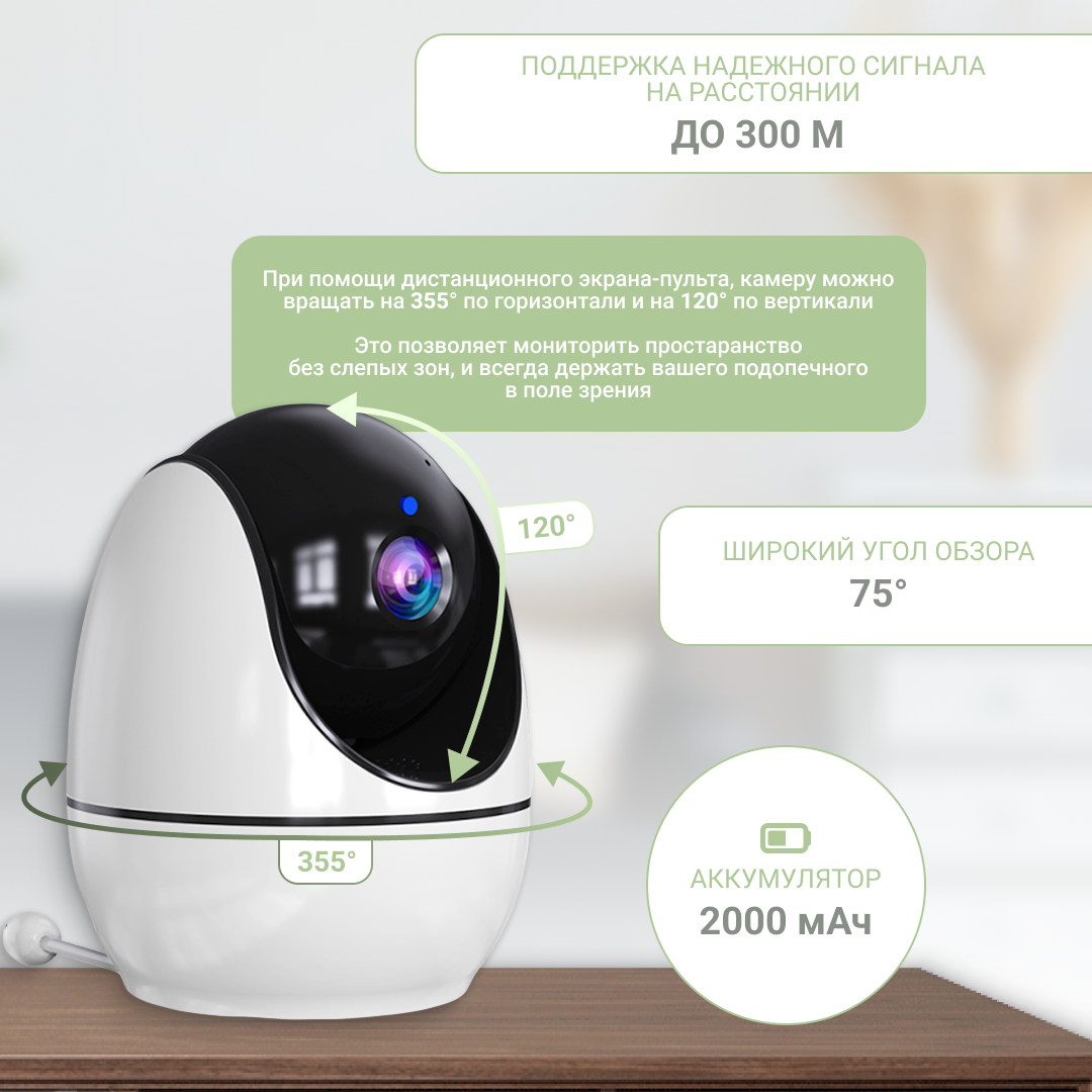 Детский блок может проигрывать 8 различных успокаивающих мелодий. Вы можете дистанционно управлять поворотом камеры. Вращение камеры по горизонтали - 355°, по вертикали - 75°.