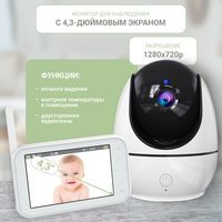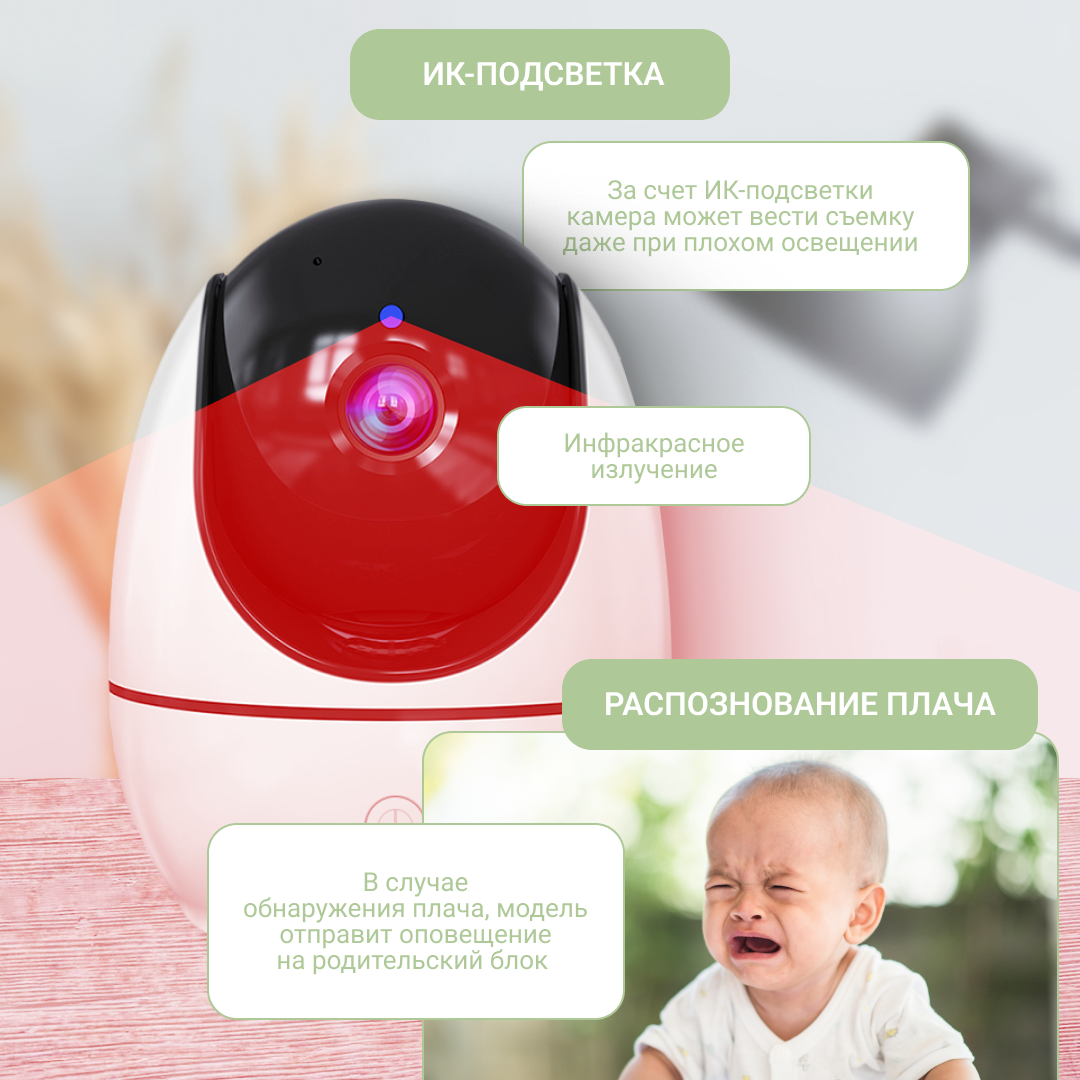 голосовая активация (VOX), датчик температуры, двусторонняя голосовая связь, колыбельные мелодии, подвижная камера, работа от сети 220 В, функция ночного видения