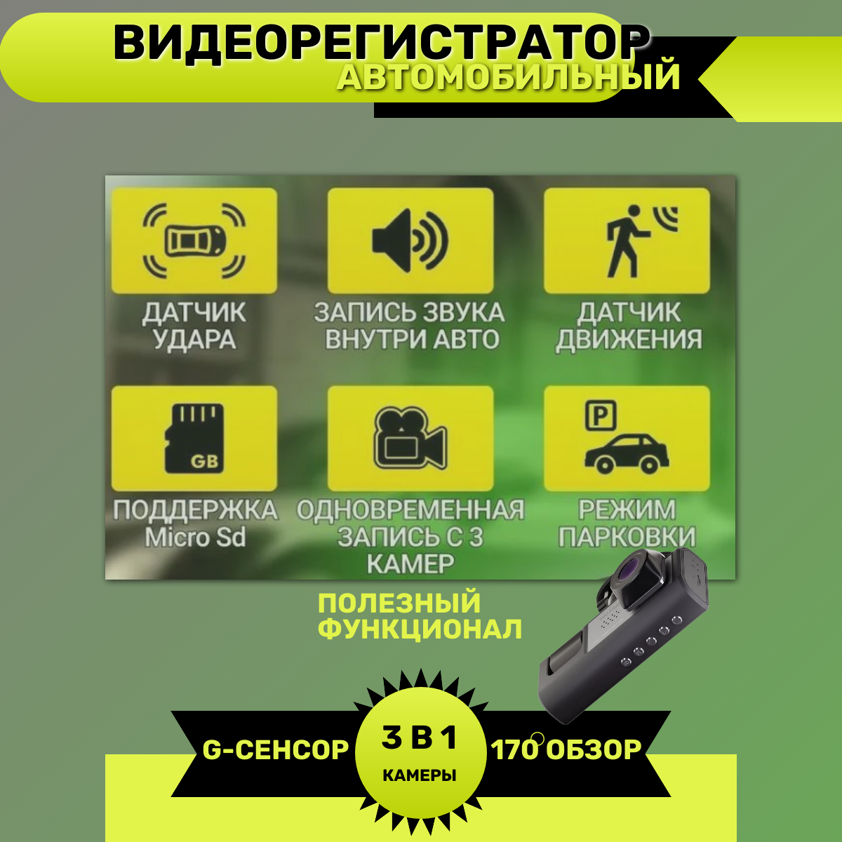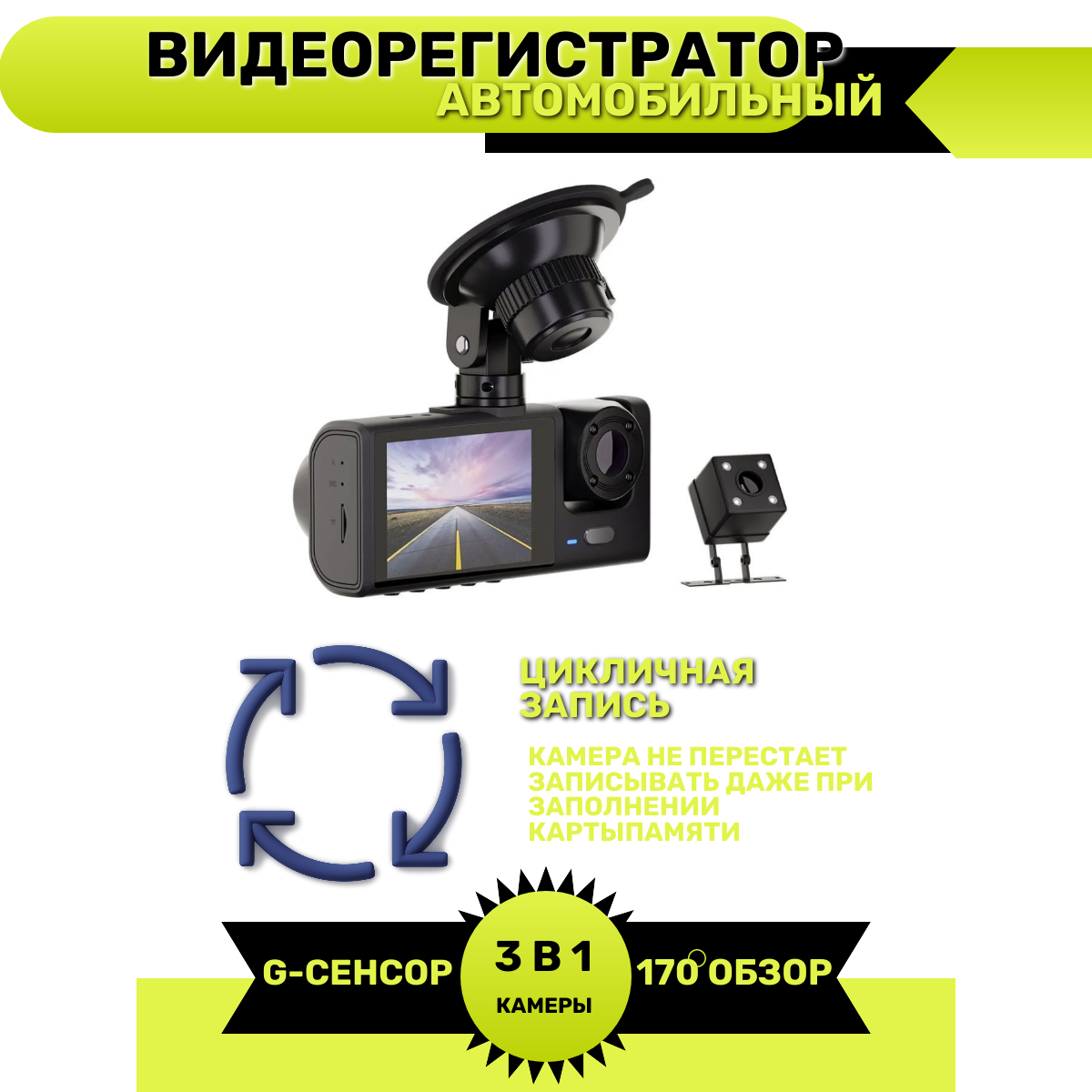 Купить Видеорегистратор Baobioki HD 3-в-1 с камерой заднего вида и широким углом обзора с доставкой по всей России.