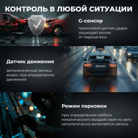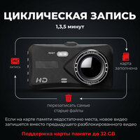 - высокое качество записи камеры для автомобиля с 4-дюймовым сенсорным экраном IPS и функцией ночного видения для хорошей видимости при плохом освещении и в условиях непогоды (дождь, метель, туман). Регистратор с двумя камерами поддерживает формат видео AVI, формат изображения JPG, высокое разрешение видео 1080FHD. А встроенный датчик гарантирует сохранность записей в момент резкого изменения траектории движения автомобиля;