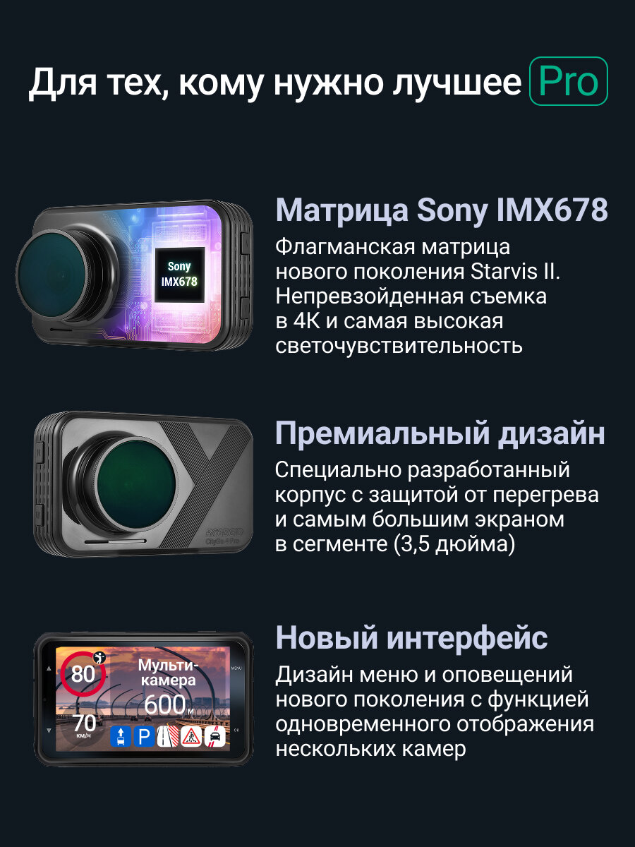 Матрица нового поколения Sony Starvis2 IMX678 обеспечивает превосходное качество видео и днем, и ночью. Видео записывается в реальном разрешении 4К (3840 × 2160) при 30 к/с, поэтому четкость и детализация не падают даже на большой скорости.