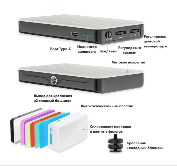 Светодиодный осветитель для фото и видео - это перспективное устройство нового поколения, которое поможет создать объёмную картинку и идеальный свет для видео и фото съемок. С помощью плавной регулировки значений цветовой температуры, вы сможете настроить свет по вашему вкусу. Лампа оснащена встроенным аккумулятором и компактным размером, что гарантирует удобство и простоту в использовании. Кроме того, это универсальная подсветка для видеосъемок, которую можно подключить к любому USB-источнику питания.