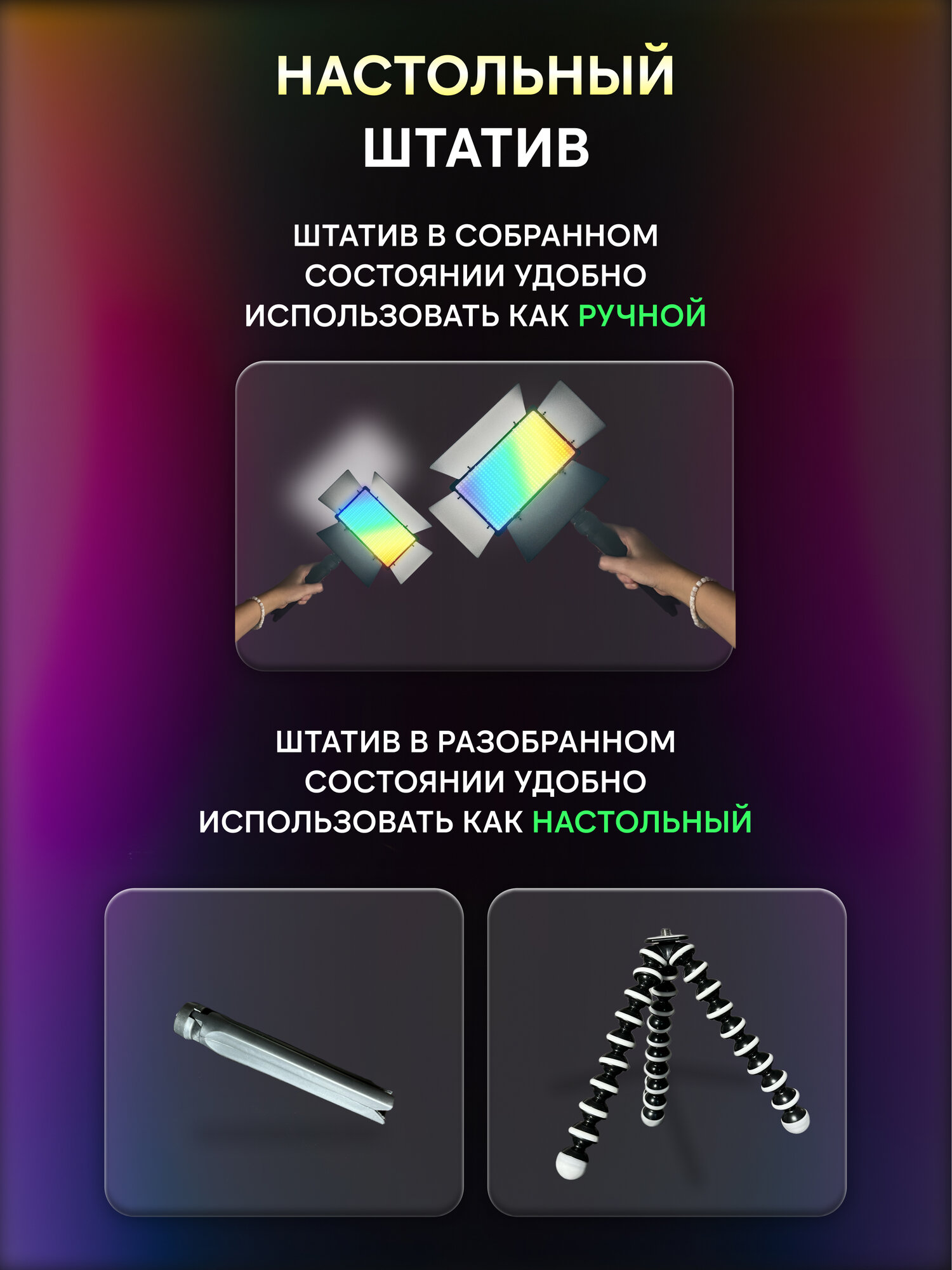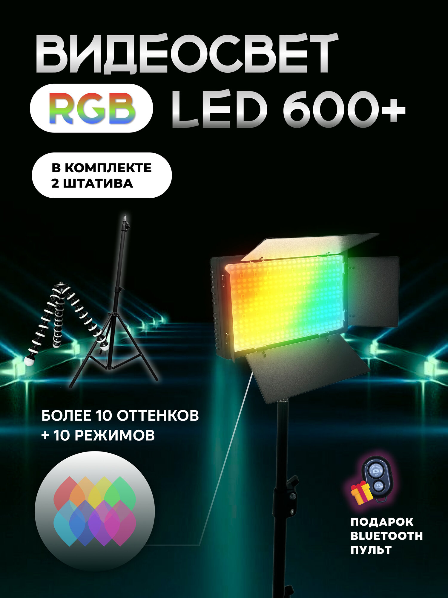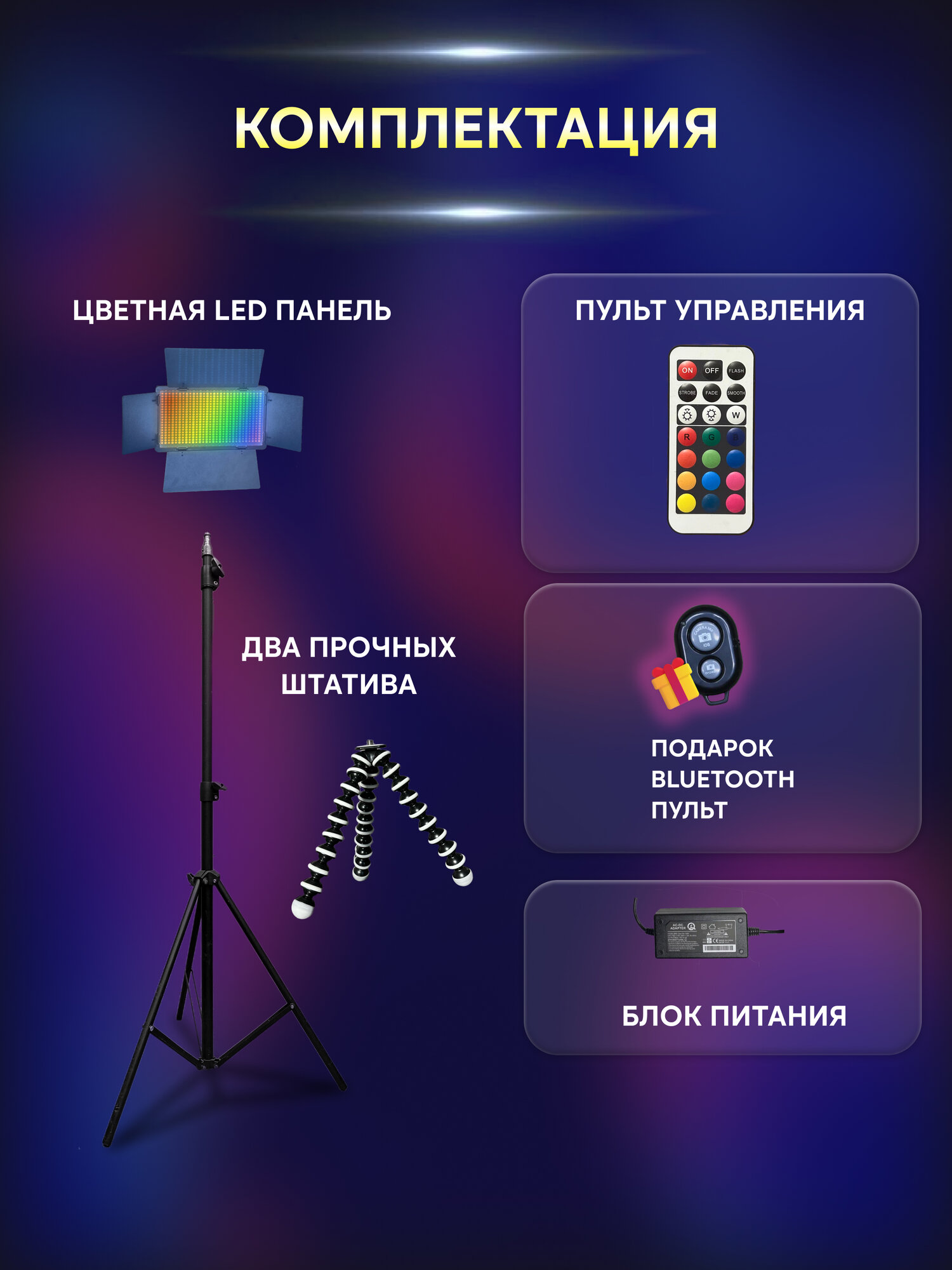 Просим заметить, что все товары проверяются нами индивидуально! В случае обнаружения неполадки у видео света сразу обращайтесь по контактам в брошюре. Видеосвет LED-U600 RGB с усиленным штативом имеет 312 светодиодов led (лэд) и 40 светодиодов RGB. В комплектацию входит: видеосвет LED U-600 RGB размером 20х11 см, штатив усиленный, крепление (шарнир) для видеосвета на штатив, который позволяет повернуть видео свет на 360 градусов в любую сторону и обеспечить бесперебойную работу профессионального света, а также блок питания. В подарок мы даем bluetooth-пульт и настольный штатив Осьминог, который можно использовать в качестве держателя. Цветной видеосвет является идеальным вариантом для работы и отдыха, так как помимо 3 стандартных режимом (холодный, теплый, смешанный) имеются 10 цветных (красный, синий, зеленый и другие) и 4 динамических режима, надежный инструмент для мастеров бьюти индустрии: бровист, косметолог, визажист, стилист, фотограф, блогер, для специалистов макияжа, ресниц, маникюра, шугаринга, фотосессий, видеосъемок, Тик Ток, для всех, кому необходимо качественное освещение. Штатив регулируется на высоту от 70 до 210 см и устойчиво стоит с помощью треноги. Мощность осветителя 40 Вт, яркость 3600 люменов, а цветовая температура с помощью диммеров или пульта ДУ регулируется в диапазоне от 3200К до 5600К. Питание происходит за счет блока питания и розетки 220В. Качественное осветительное оборудование — это необходимый элемент любого профессионала, и мы уверены, что видеосвет LED U-600 RGB станет незаменимым помощником для вашей работы.