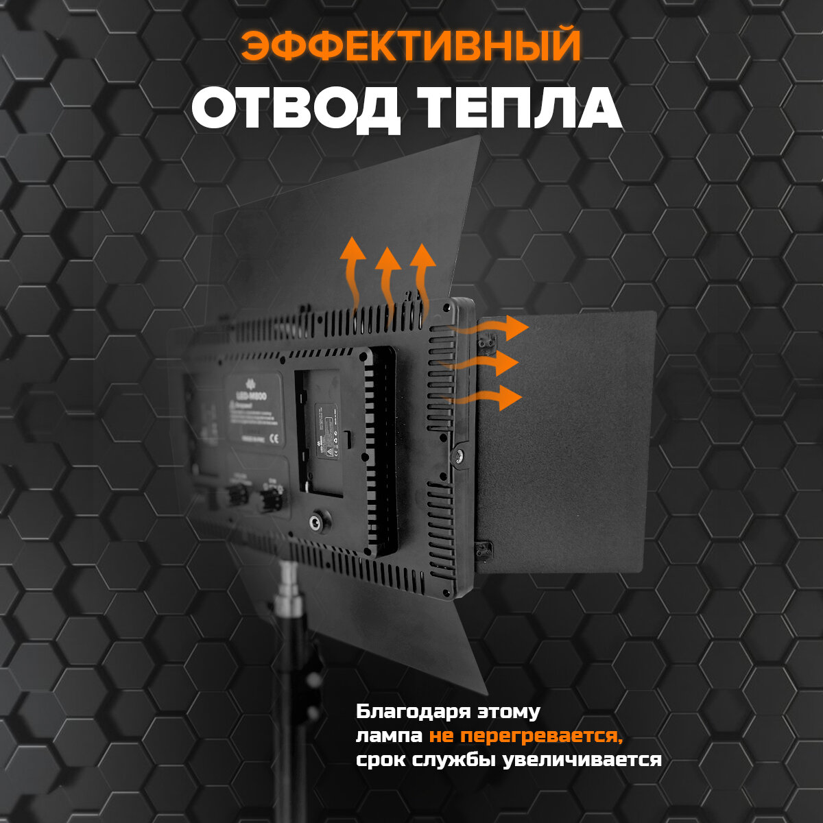 Видеосвет оснащен поворотными направляющими шторками и шарнирным механизмом для наклона в пределах 360 градусов. Это позволяет легко регулировать направление и интенсивность света в зависимости от потребностей съемки.