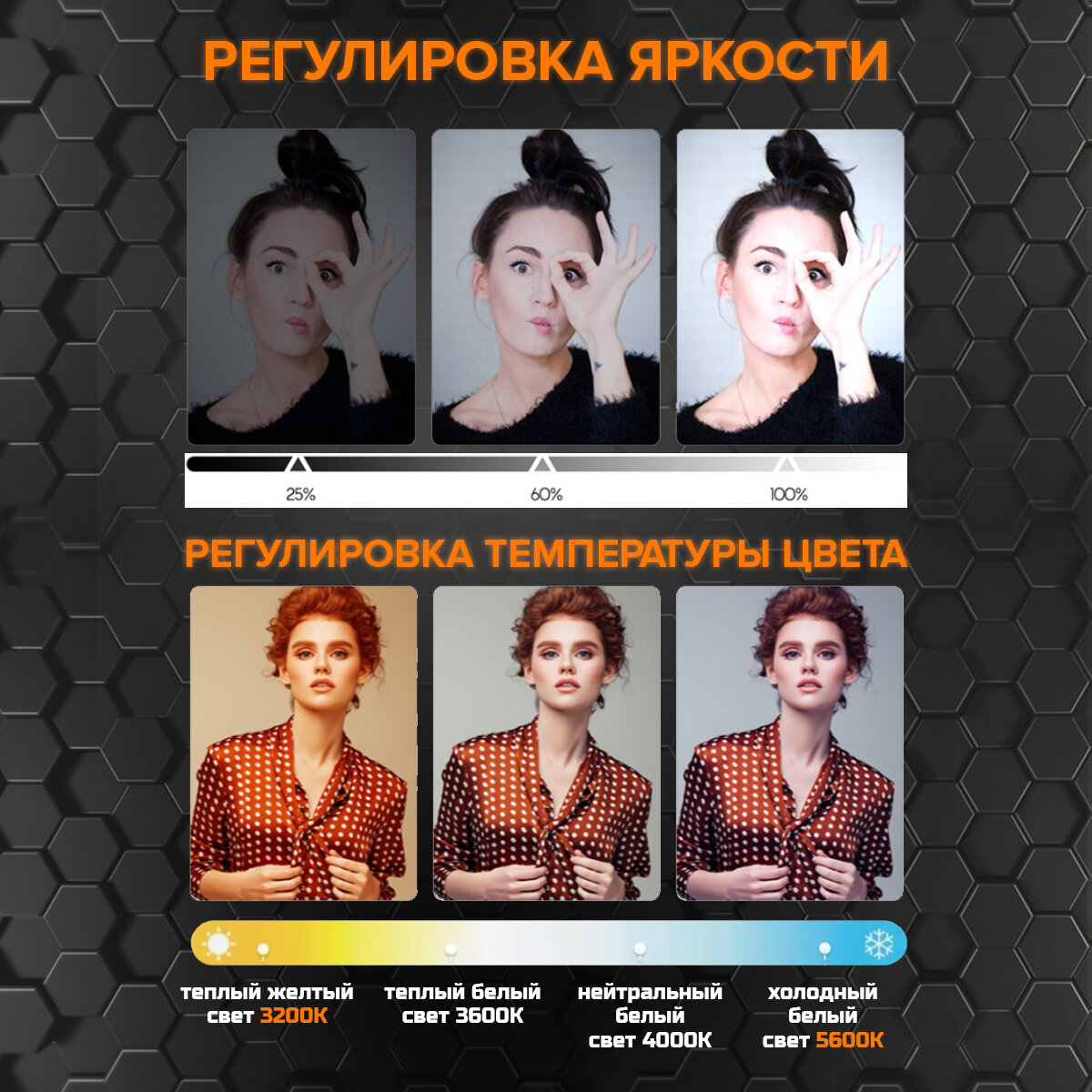 Цветовая температура световой панели регулируется в диапазоне от 3200К до 5600К с помощью диммера, расположенного на корпусе лампы. Индекс цветопередачи составляет 90-95%, что позволяет точно передавать цвет освещаемых объектов.