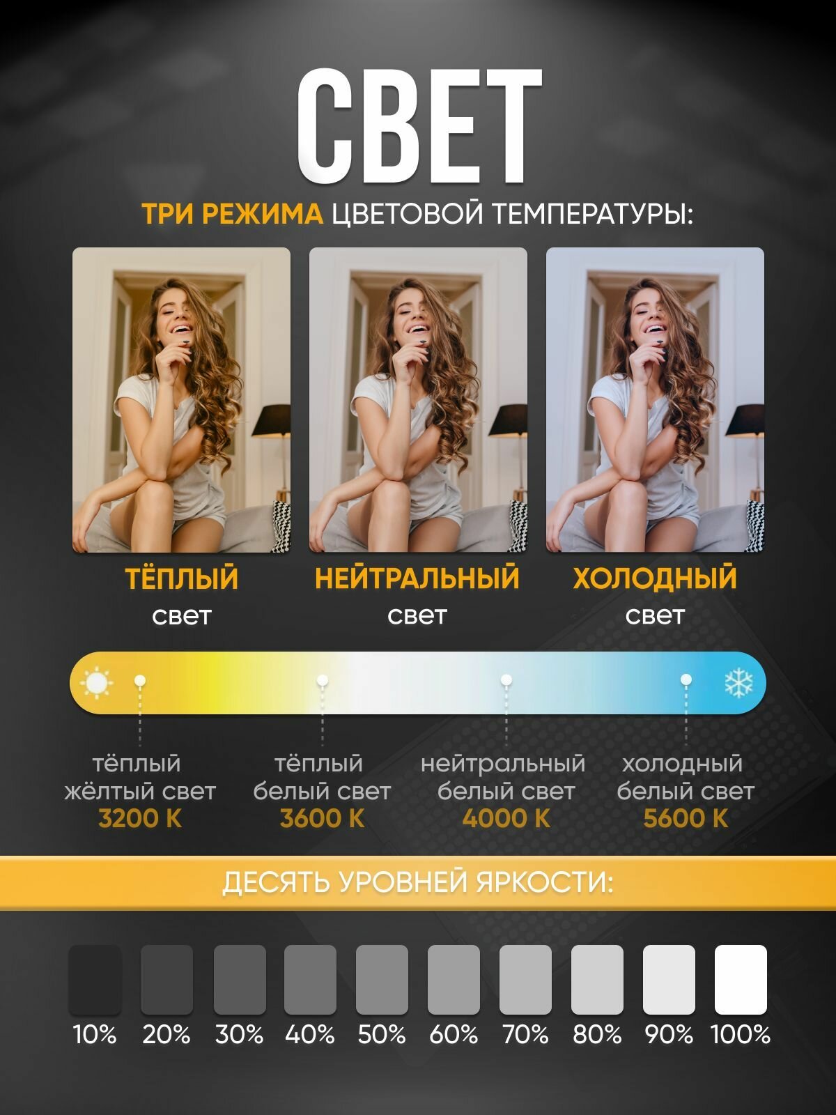 Цветовая температура регулируется в диапазоне от 3200К до 5600К, что позволяет создавать как теплый, так и холодный свет. Индекс цветопередачи составляет не менее 95%, что гарантирует точное воспроизведение цвета освещаемых объектов.