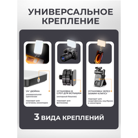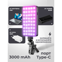 выбор режима свечения, выбор цвета свечения, держатель для смартфона, пульт ДУ, регулировка цветовой температуры, регулировка яркости освещения, стойка в комплекте, штатив в комплекте