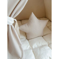 В комплект входит: вигвам с окном и шторкой, коврик набивной двухсторонний, каркас из 4-х складных палок, перья на палочках, украшение звездочки, помпоны на дверках, подушка звезда, система антискладывания.