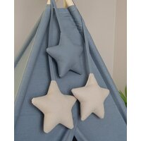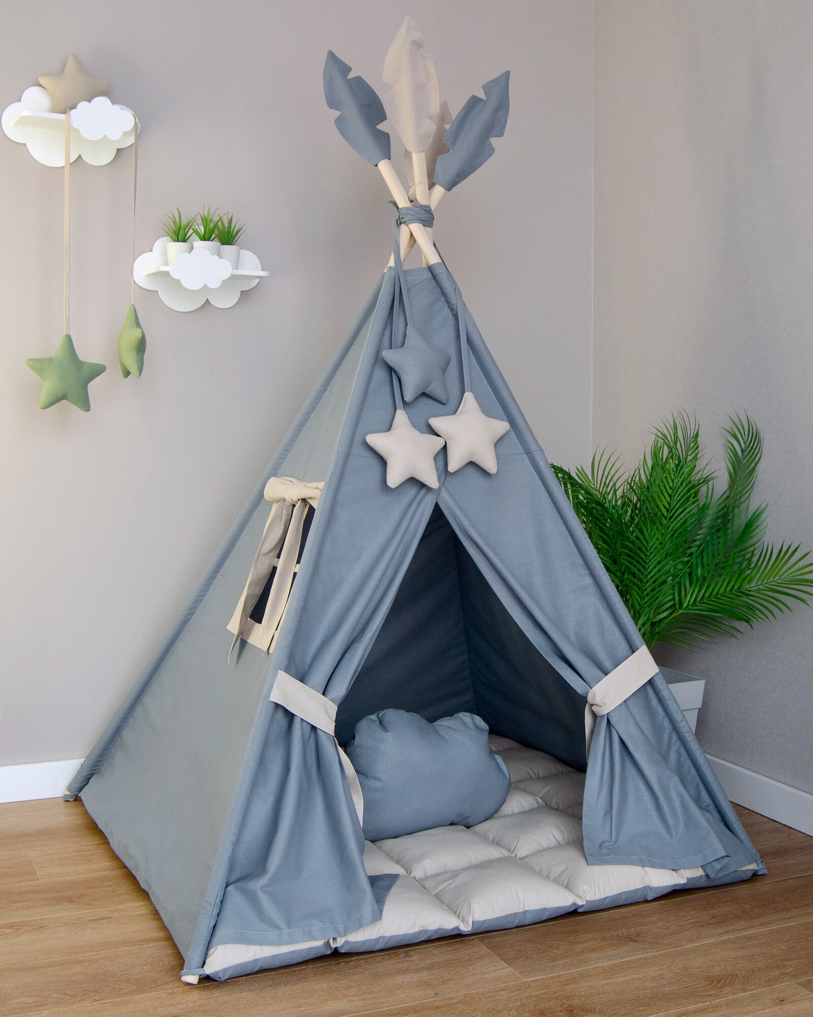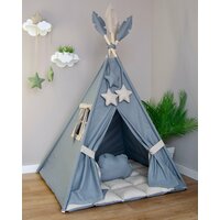 В комплект входит: вигвам с окном и шторкой, коврик набивной двухсторонний, каркас из 4-х палок, перья на палочках, украшение звездочки, помпоны на дверках, подушка "Облако", система антискладывания.