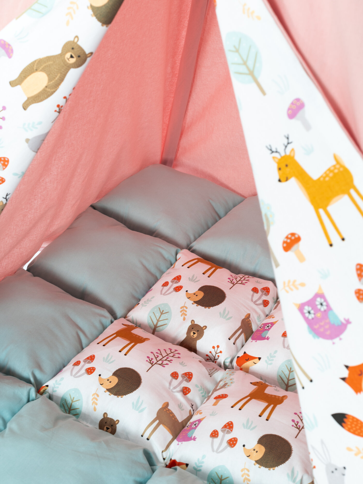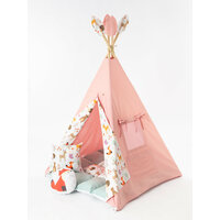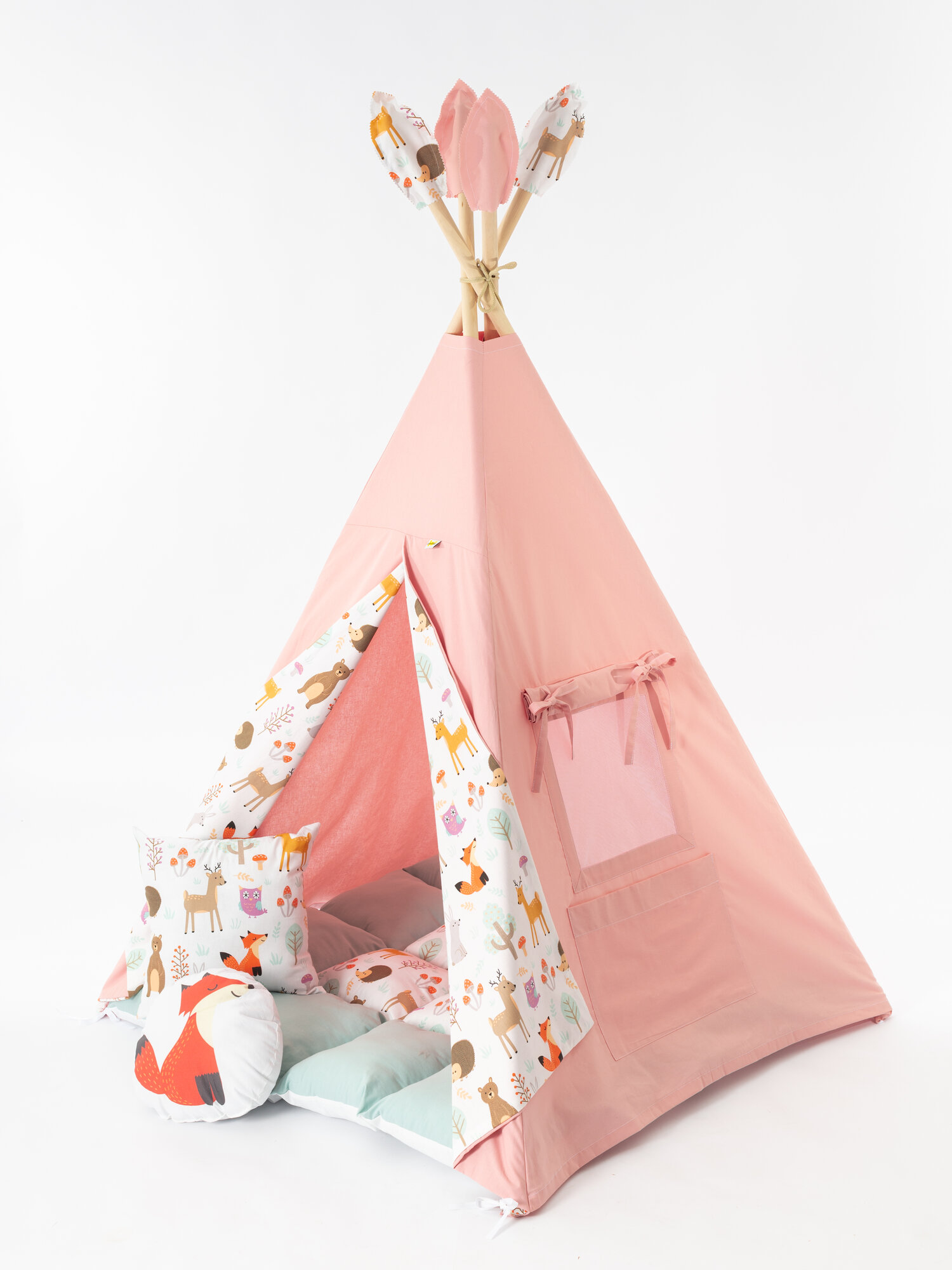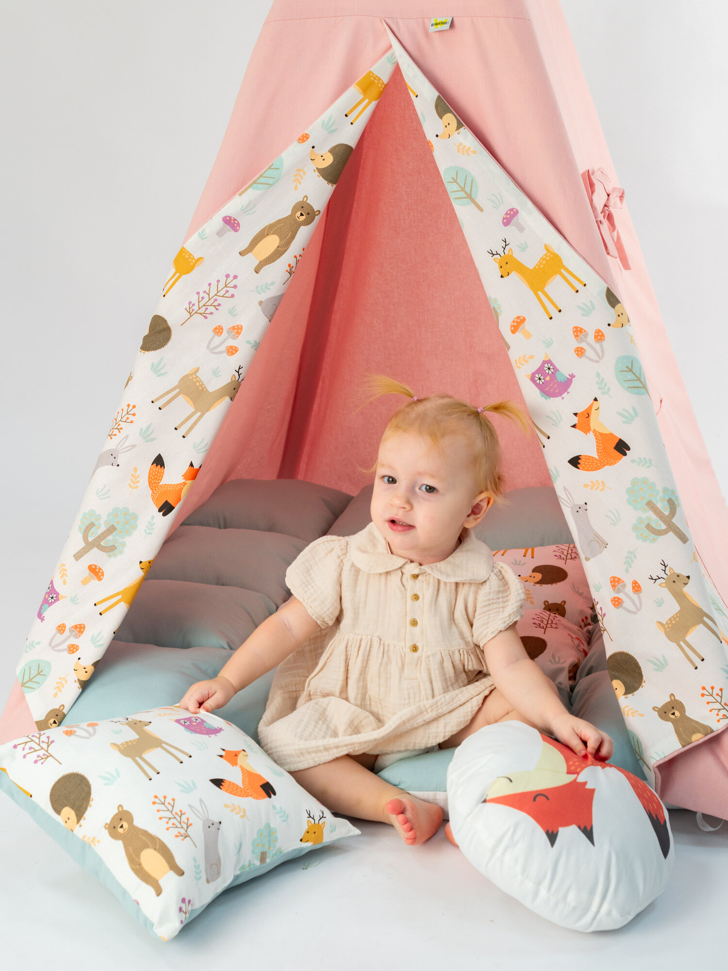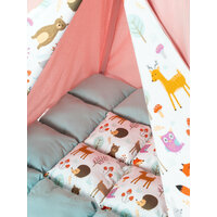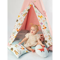 Ткань-основа вигвама, палки, коврик бомбон, 1 подушка 35 см/35 см, 1 игрушка, флажки, система антискладывания, чехол для хранения