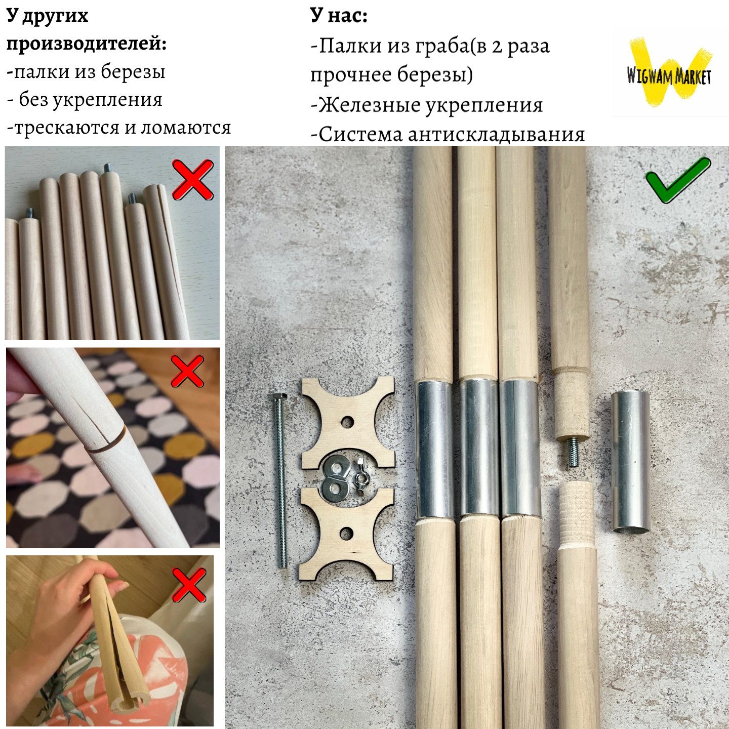 Мы изготавливаем детские вигвамы с 2015 года. За это время мы порадовали более 5000 детей и родителей. Собрали много отзывов и отобрали для наших вигвамов только самые качественные материалы. Мы используем только натуральные гипоаллергенные материалы: 100% хлопок, натуральное дерево, гипоаллергенный холлофайбер высшего качества. Наши товары имеют сертификаты качества и проверены лабораторными исследованиями.