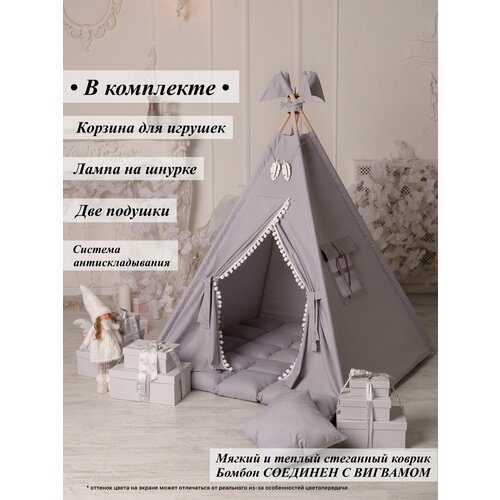 | Комплектация | Вигвам, коврик, опора, флажки, две подушки, система антискладывания, корзина для игрушек, гирлянда из флажков, кемпинговая лампа |