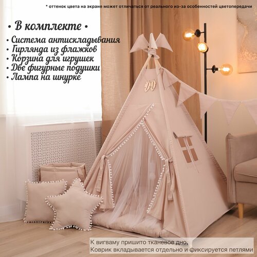 Вигвам, коврик, опоры, фажки, две подушки, корзина для игрушек, система антискладывания, кемпинговая лампа
