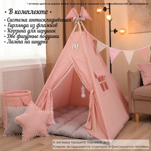 Вигвам Палатка детская игровая , домик для детей , две подушки, корзина для игрушек, кемпинговая лампа, гирлянда